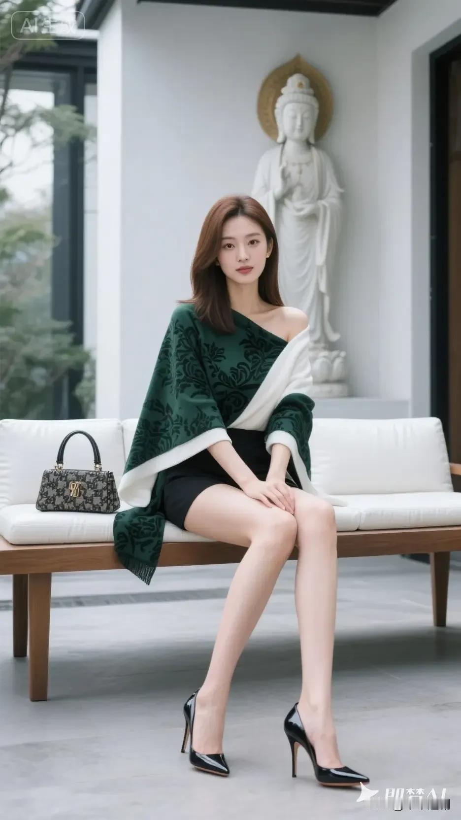 墨绿披肩裹着东方韵味,黑裙与高跟鞋勾勒出利落线条,在静谧的禅意空间里,温柔与气场