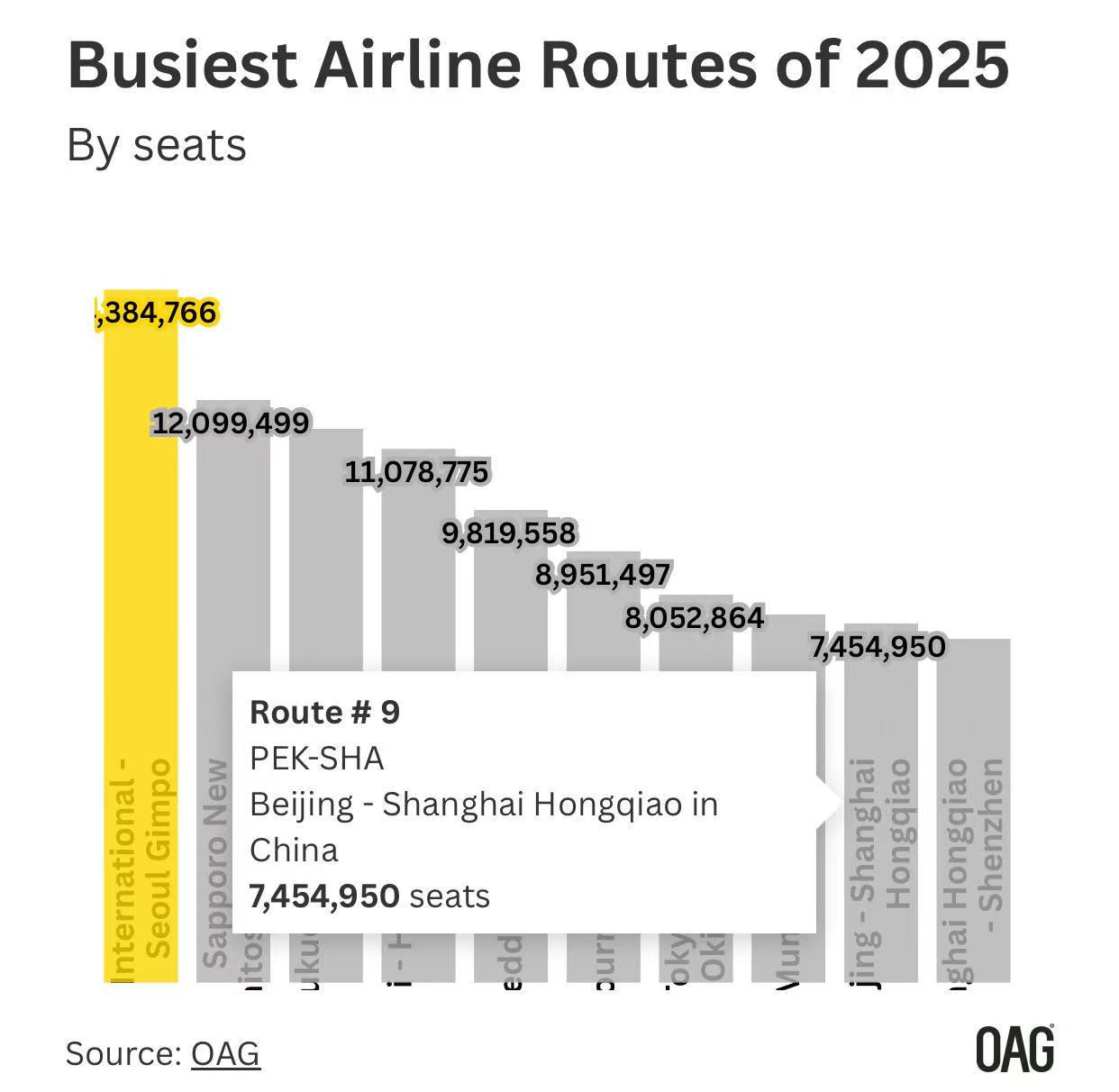 从京沪快线数据看高铁对民航的影响 真正的颠覆,往往来自生态替换,而非同赛道内的竞争。 OAG最近发布了一些航线统计数据,其中包括了全球最繁忙的国内航线。 不出意料地,济州-首尔航线依旧排在第一。 北京首都-上海虹桥排名全球第九,并国内第一,运力达750万个座位,如果按照85%的客座率来算的话,大概630万人次。 尽管该航线在国内仍保持领先地位,但其运力较2024年下降了3%,比2019年水平低8%。 按照京沪之间的实际客流量,北京首都-上海虹桥本不应该排名这么低。 除了北京大兴和上海浦东分流了一部分客流外(北京-上海航线全部加起来大概850万人次)。 最大的原因,还是京沪高铁太生猛了。 2025年京沪高铁本线列车(始发终到)客流约5000万人次。 本线列车中,“端到端且全程不下车”的旅客占比约45%—55%(结合铁路“优先长途”票额分配机制、标杆车高频开行特征及商务客流规律)。 也就是说,京沪高铁(北京往返上海)中途不下车的端到端直达旅客大概在2500万人次。 这比民航京沪快线的客流要多太多了。 为什么会这样? 京沪高铁全程1300公里,最快4小时18分左右,正好处于高铁对民航最具竞争力的“黄金距离”(通常认为800-1500km区间竞争最激烈)。 高铁准点率高(远超民航)、班次极密(如今最短4分钟一班)、票价更低(二等座通常在500-600元区间,而民航经济舱全价1600+元)、且受天气影响较小,这些都对1000公里左右航线形成强替代效应。 现阶段来看,京沪之间,高铁和民航的客流大概是四比一,并且高铁还在持续增开G字头列车,对于民航的压力,逐渐增大。 2025年5月起,东航和国航在首都-虹桥推出跨航司自愿签转服务,到港后可快速换乘下一班,从这个角度来说,高铁间接促成了民航服务质量的提高。 长远来看,京沪之间,大概率会形成是高铁走量,民航走价的相对稳定的局面。 未来只要高铁继续加密或提速,民航仍将面临票价下行和高峰时段分流压力。 有时候想想,打败你的,从来不是你的行业内竞争对手,而是另一行业的。 跨界颠覆,不外如是。 就像方便面被外面打败,小偷被移动支付打败,数码相机被手机干掉一个道理。 高铁客流量 京沪快线 京沪高铁 图片来自网络