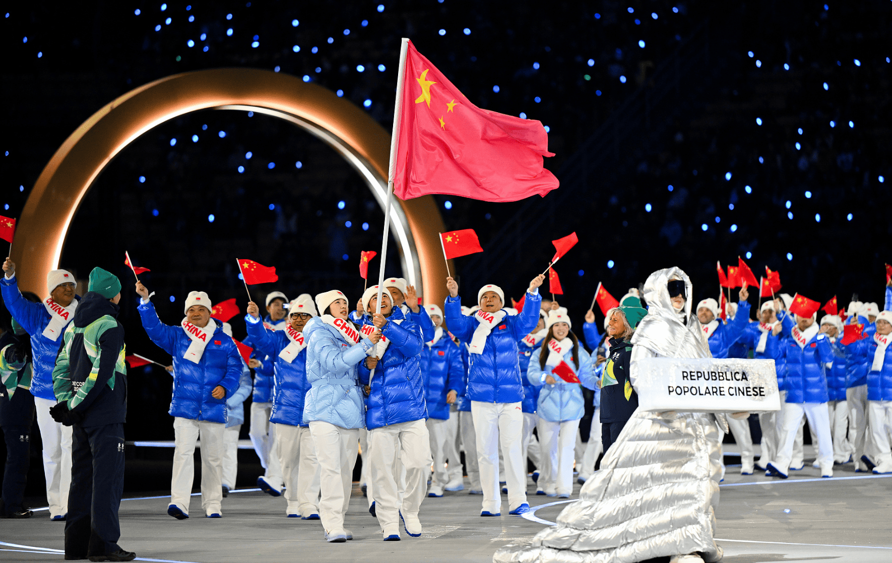 虎扑02月07日讯米兰-科尔蒂纳冬奥会开幕式,中国体育代表团入场。由速度滑冰运动员宁忠岩和短道速滑运动员张楚桐担任中国代表团旗手。