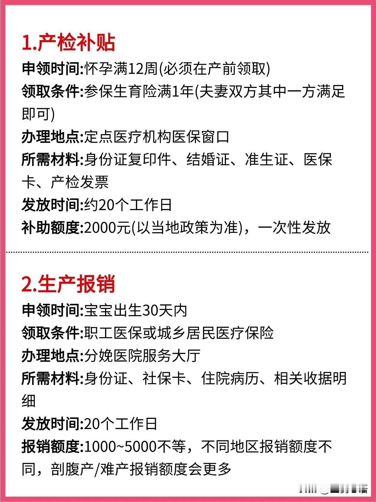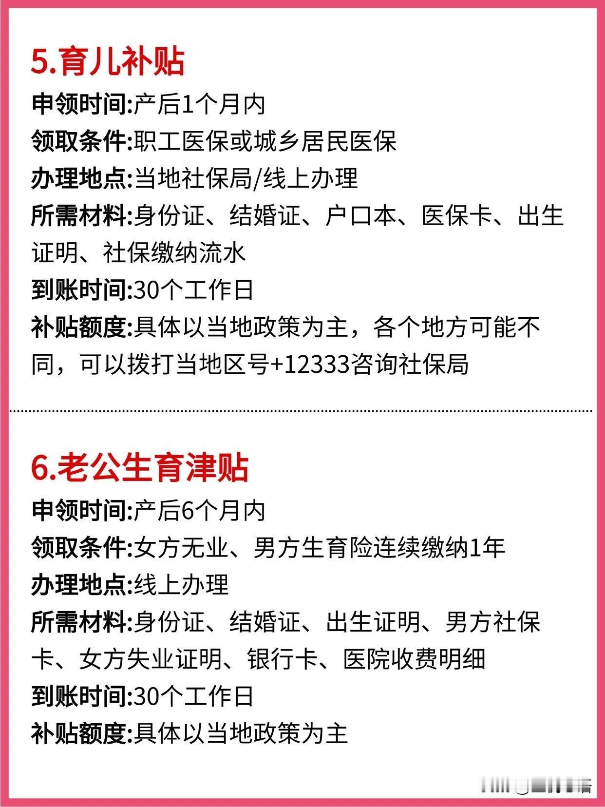 2026生娃补贴新政真的太香了! 从产检到养娃,8项福利全覆盖, 错过真的亏大了! 怀孕满12周就能领产检补贴,生娃有生产报销和分娩津贴,产假还有生育津贴,养娃能领育儿补贴,个税还能退税。 老公也能领津贴和陪产假补贴,女方没工作的话,男方缴了生育险也能申领,太贴心了! 这些补贴门槛都不高, 材料备齐线上线下都能办,到账也快。 建议准爸妈们赶紧收藏攻略,别因为不懂政策漏掉福利,能领的都领上,养娃压力能小一大截! 各地标准不一样,记得打12333问问当地具体政策~