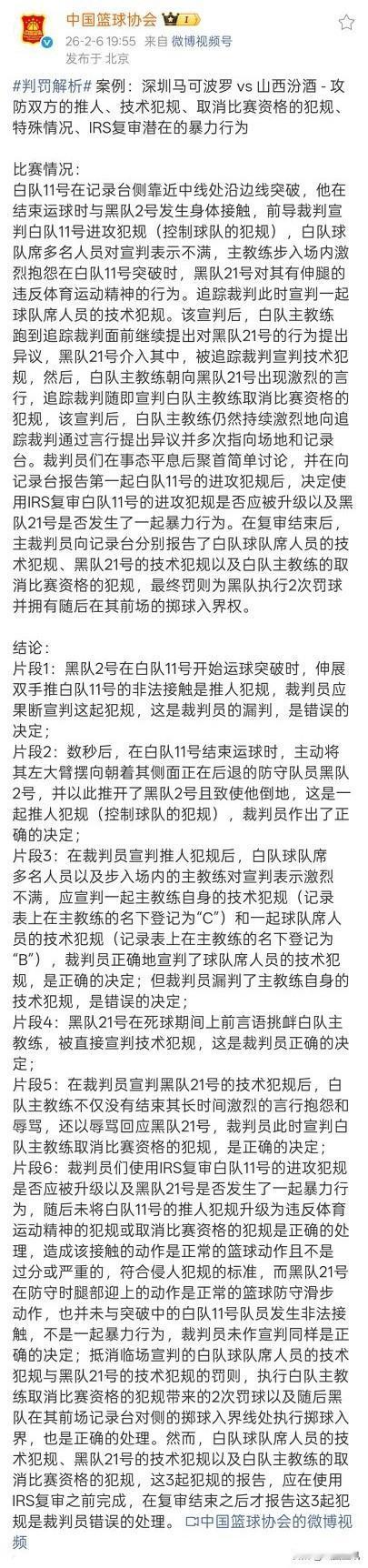 还记得主教练被夺权离场、球员四次技术犯规的比赛吗?时隔半月,深圳队与山西男篮争议判罚裁决出炉:“深圳队2号卢鹏羽在山西队11号迪亚洛开始运球突破时,伸展双手推白队11号的非法接触是推人犯规,裁判员应果断宣判这起犯规,这是裁判员的漏判,是错误的决定。”正因为此次犯规没有被及时判罚并吹停比赛,所以导致了后续的山西男篮和深圳男篮四名球员各领一次技术、山西男篮主教练潘江被夺权的混乱后果!