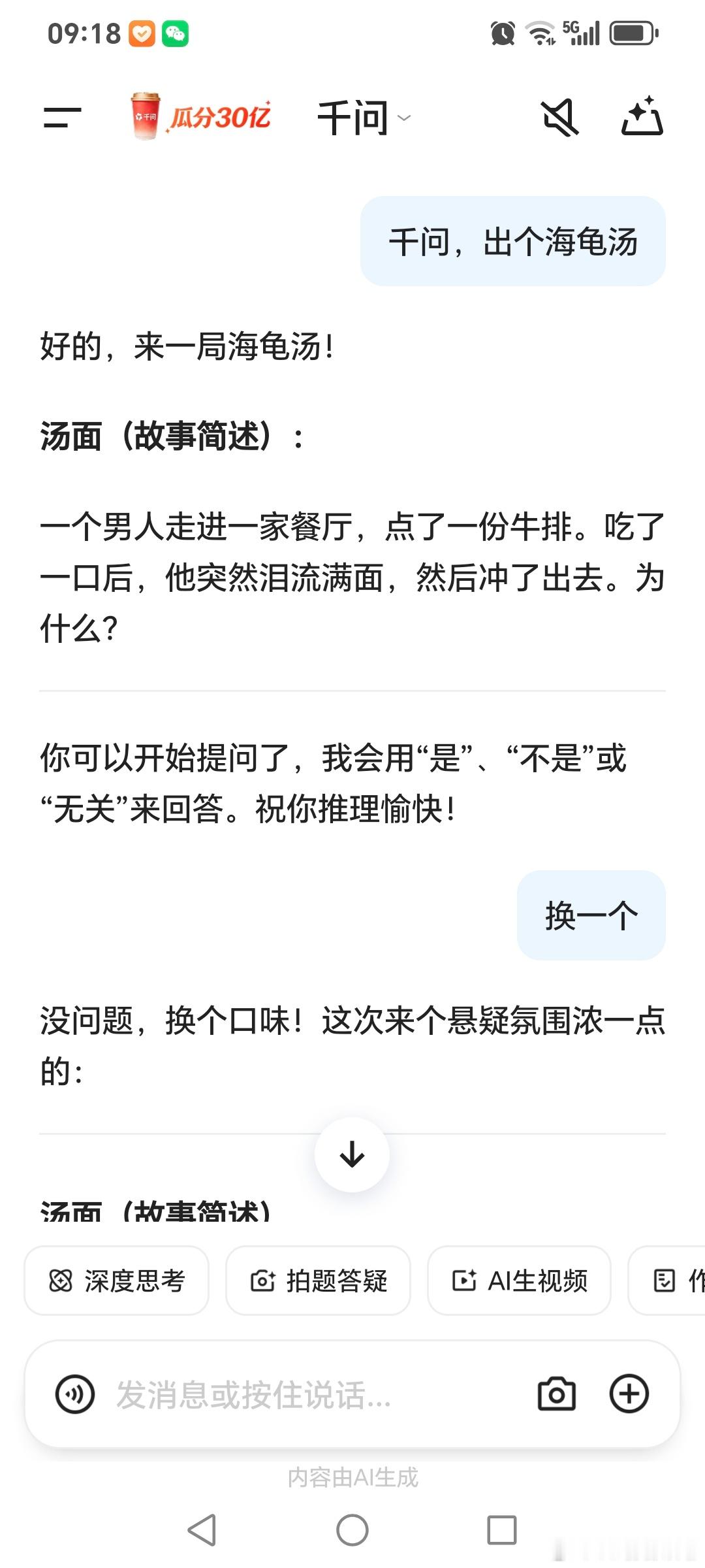 不过,我让千问陪我玩海龟汤游戏,它但是反应很快。千问9小时破1000万