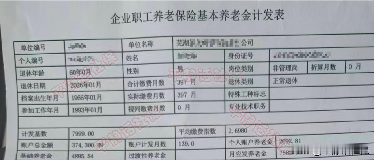 安徽养老金! 退休地安徽省芜湖市。某国有企业,男性,1966年1月生人,1993年1月参加工作,2026年1月退休,年龄60岁没有选择延长。累计缴费33年1个月,属于非管理岗位退休人员,个人账户累计37.43万,指数高达2.6980。 养老金核定结果,基础养老金4895.54元,个人账户养老金2692.81元,两项合计7588.35元。 可能很多人会第一反应是算错了吧,为什么93年1月参加工作,没有过渡性养老金呢? 这同样也是一起外省转入的案例,但并不是转移过程中丢失重要信息造成的年限缺失,而是因为参保人在原省份时,虽然1993年1月参加了工作,并且也缴纳了社保,但并不是企业的正式职工。所以视同缴费年限是无法被认定的。 后期转为正式职工,并且收入可观,即使没有过渡性养老金,退休仍旧达到了7500元。