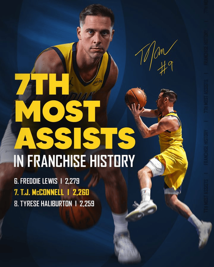 据统计,麦康奈尔在步行者生涯的总助攻数来到了2260次,超越哈利伯顿(2259次),位居队史第7。
