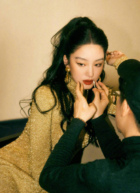 杨采钰工作室分享一组时尚写真,杨采钰穿着金色亮片礼服裙,勾勒曼妙好身材