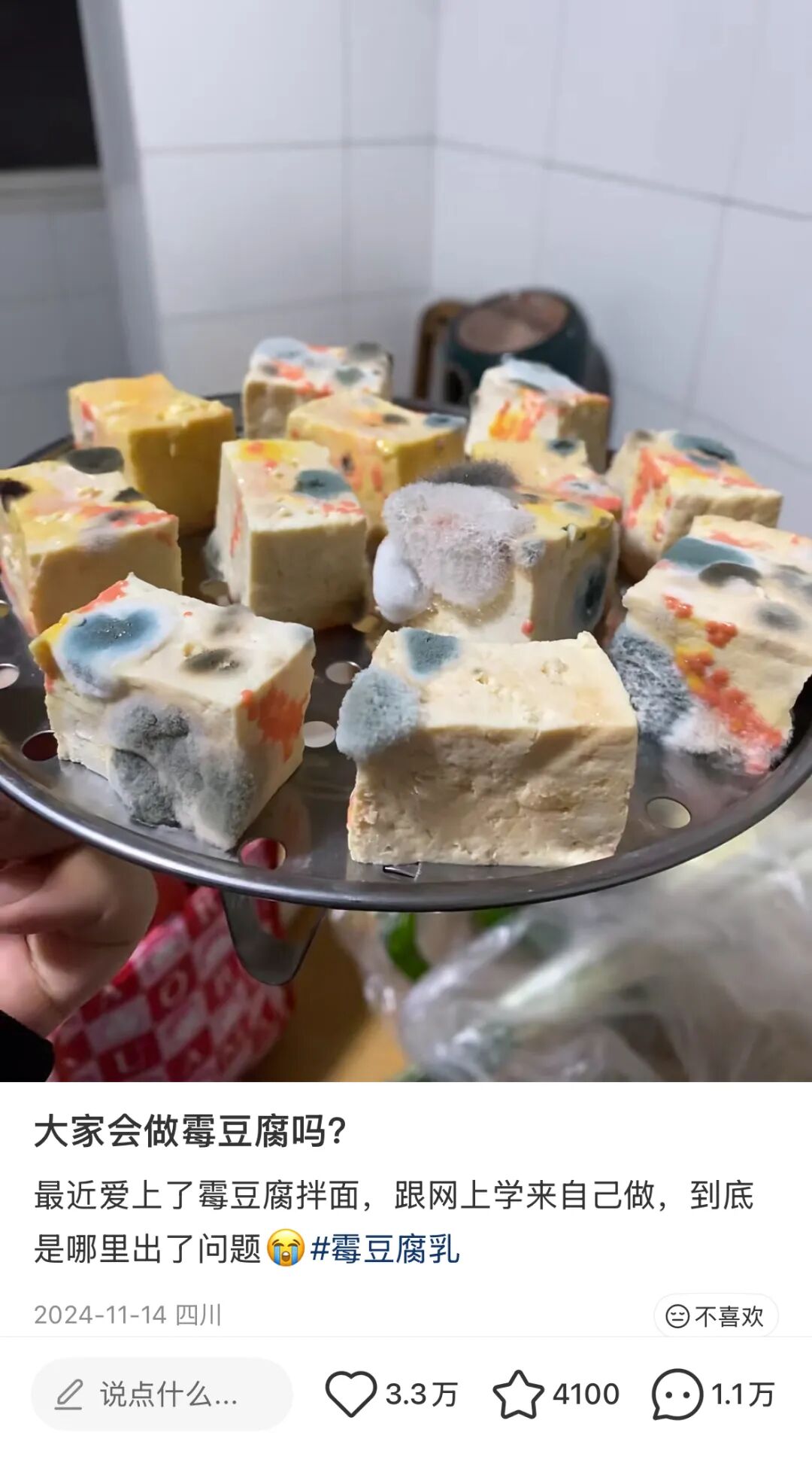 近期,不少网友跟风尝试家庭自制霉豆腐,社交平台上有“成功出罐,风味绝佳”的分享,也有“豆腐长绿霉,只能丢弃”的失败案例。对此,杨茜明确表示,从食品安全角度出发,并不推荐家庭自制霉豆腐,尤其是缺乏制作经验的新手。