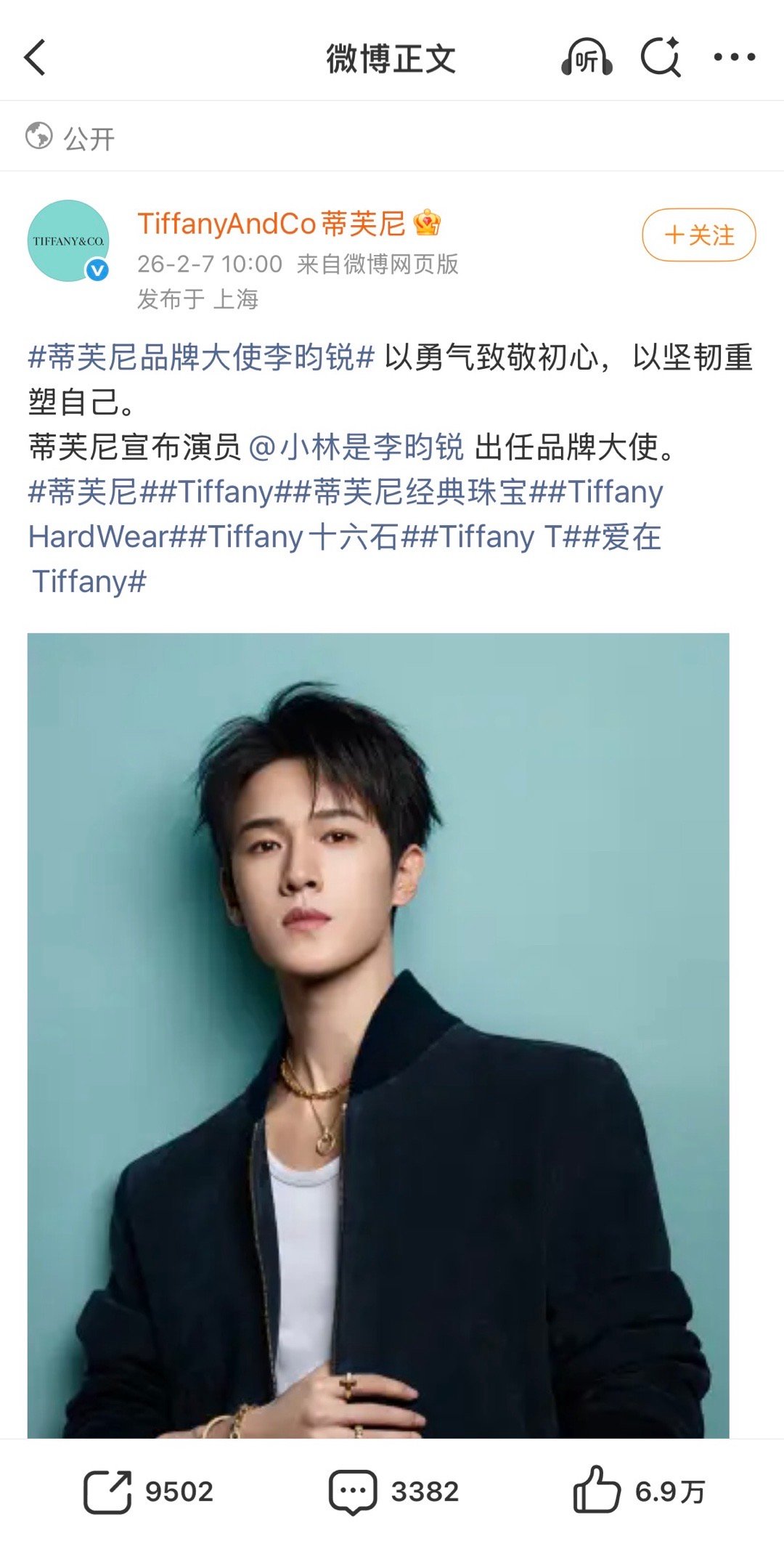 宣了宣了!!!蒂芙尼正式官宣宣布李昀锐出任品牌大使,完全无考察期空降,小林真的好