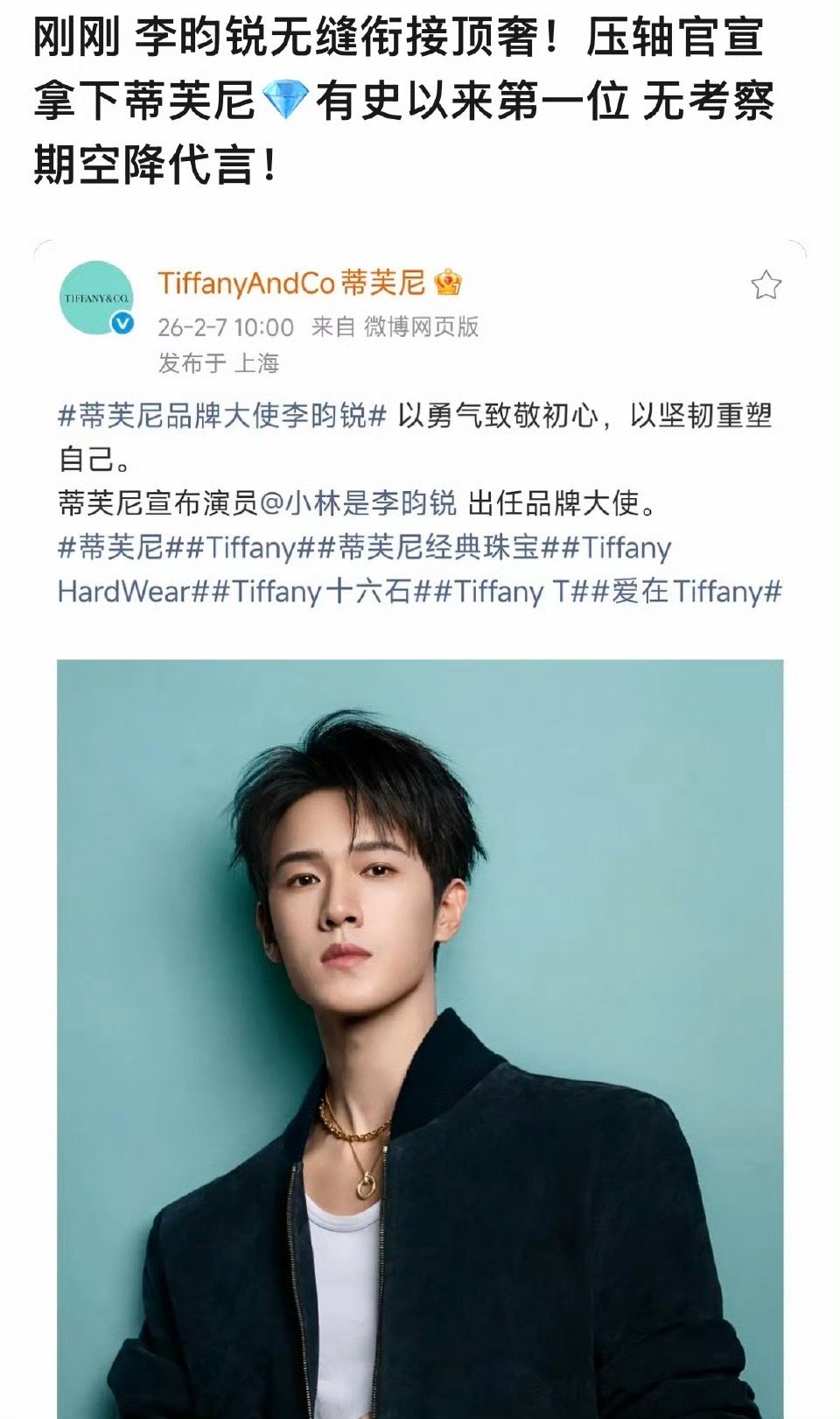 李昀锐蒂芙尼官宣了,无考察空降压轴官宣,有史以来第一位,有作品气质好奢牌都喜欢他