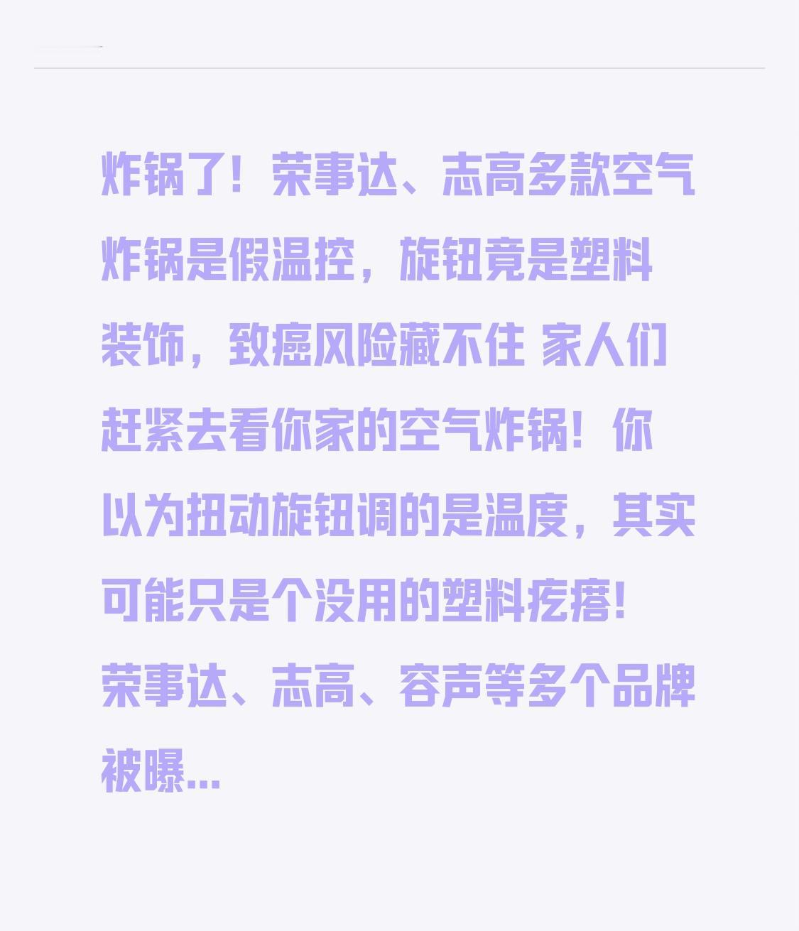 炸锅了!荣事达、志高多款空气炸锅是假温控,旋钮竟是塑料装饰,致癌风险藏不住 家人们赶紧去看你家的空气炸锅!你以为扭动旋钮调的是温度,其实可能只是个没用的塑料疙瘩!荣事达、志高、容声等多个品牌被曝“假温度旋钮”,拆开一看里面空空如也,连根连接线都没有,这哪是家电,分明是坑人的“智商税”! 现在谁家里没个空气炸锅?烤鸡翅、炸薯条、烘红薯,方便又不用多放油,尤其是有老人小孩的家庭,天天用它做辅食、做零食。可你根本想不到,那些百元左右的低价空气炸锅,早就把核心的温控系统给省了!安徽的消费者拆开荣事达空气炸锅,当场傻眼:温度旋钮背后就是块塑料装饰,不管拧到100℃还是200℃,机器都在全力加热,所谓的调温全是自欺欺人! 本以为只是个别品牌的问题,没想到转折点来了——这竟是行业公开的秘密!志高客服直接承认,BL-5806型号空气炸锅根本不能调温,固定在150℃,还狡辩是“生产批次问题”;容声更离谱,说部分型号用了统一模具,所以留着温度旋钮当摆设。有经销商偷偷爆料,抽样30多款低价空气炸锅,超过60%都是假温控,先科、南极人这些常见品牌全在列,简直是公然欺诈! 更吓人的是,假温控不只是用着不方便,还藏着致命风险!正规空气炸锅有温控传感器和保险丝,温度超标会自动断电,可这些“假旋钮”机型,本质就是“持续满功率加热”的裸奔状态。河南消防早就警示过,这种机器容易过热短路,引燃厨房杂物引发火灾;更别提健康隐患了——食物长期高温焦化,会产生世卫组织认定的2A类致癌物丙烯酰胺,长期吃对肝肾伤害极大,老人小孩最遭殃! 更讽刺的是,涉事的志高BL-5806型号,生产商慈溪奥辉电器早就因为产品不合规,被罚款近10万元,可居然还在生产销售不合格产品。而这些品牌的客服,要么甩锅“批次问题”,要么说“旋钮只是装饰”,完全不把消费者的安全当回事。有网友吐槽:“设定180℃烤鸡翅,结果外焦里生;想低温烘果干,直接烤成炭”,花几百块买的不是便利,是随时可能爆炸的“定时炸弹”! 其实不用拆机,5分钟就能辨真假!教大家三个实用方法:第一,空载测试法,把温度调到最低档,运行5分钟后开盖,要是内部烫手,肯定是假温控;第二,看认证参数,没有3C认证和GB 4706系列国标编号的,直接pass;第三,问客服要拆机图,不敢提供温控元件照片的,大概率有问题。 已经踩坑的家人也别忍气吞声!根据《消费者权益保护法》,这种虚假宣传属于欺诈,完全可以要求退一赔三,不足500元按500元算。记住一定要保留购买记录、宣传截图和测试视频,先找平台协商,协商不成直接打12315投诉,市场监管部门已经对荣事达立案调查了,咱们不能让不良商家逍遥法外! 现在大家买家电都图便宜方便,但再省钱也不能省安全!空气炸锅的核心就是温控,少了这个功能,和普通烤炉有啥区别?那些品牌为了低价竞争,偷工减料欺骗消费者,透支的不仅是信任,还有大家的健康。 你家的空气炸锅是哪个牌子?有没有遇到温度不准的情况?评论区分享你的使用体验,点赞转发,把这篇文案发给家人朋友,赶紧按方法测试家里的空气炸锅!别让一个小小的假旋钮,变成伤害家人的“隐形杀手”,也倒逼这些品牌守住底线——家电可以平价,但安全不能打折!