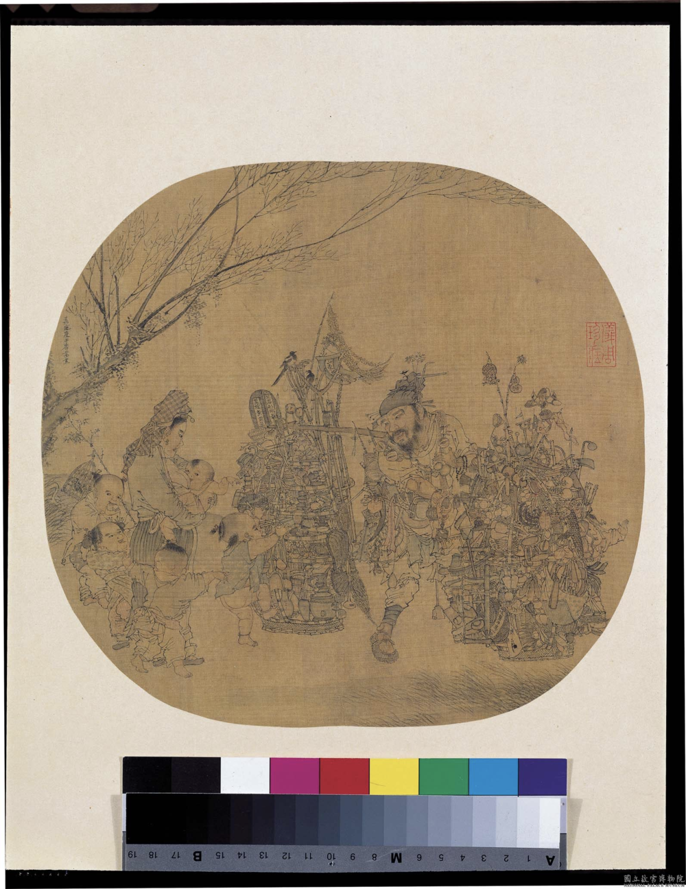 这幅画描绘的是江南乡村货郎与儿童嬉戏的情景,货担上有很多玩具