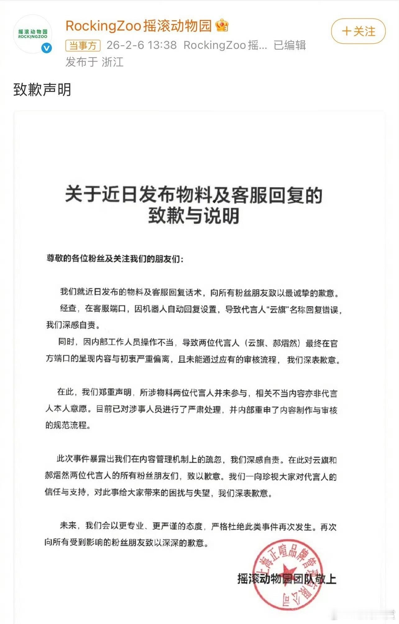 上午十点代言下午一点半解约 史上最快结束的代言出现了!云旗、郝熠然上午十点官宣双人代言,下午一点半就解约,原因是品牌方擅自发布艺人AI合成物料