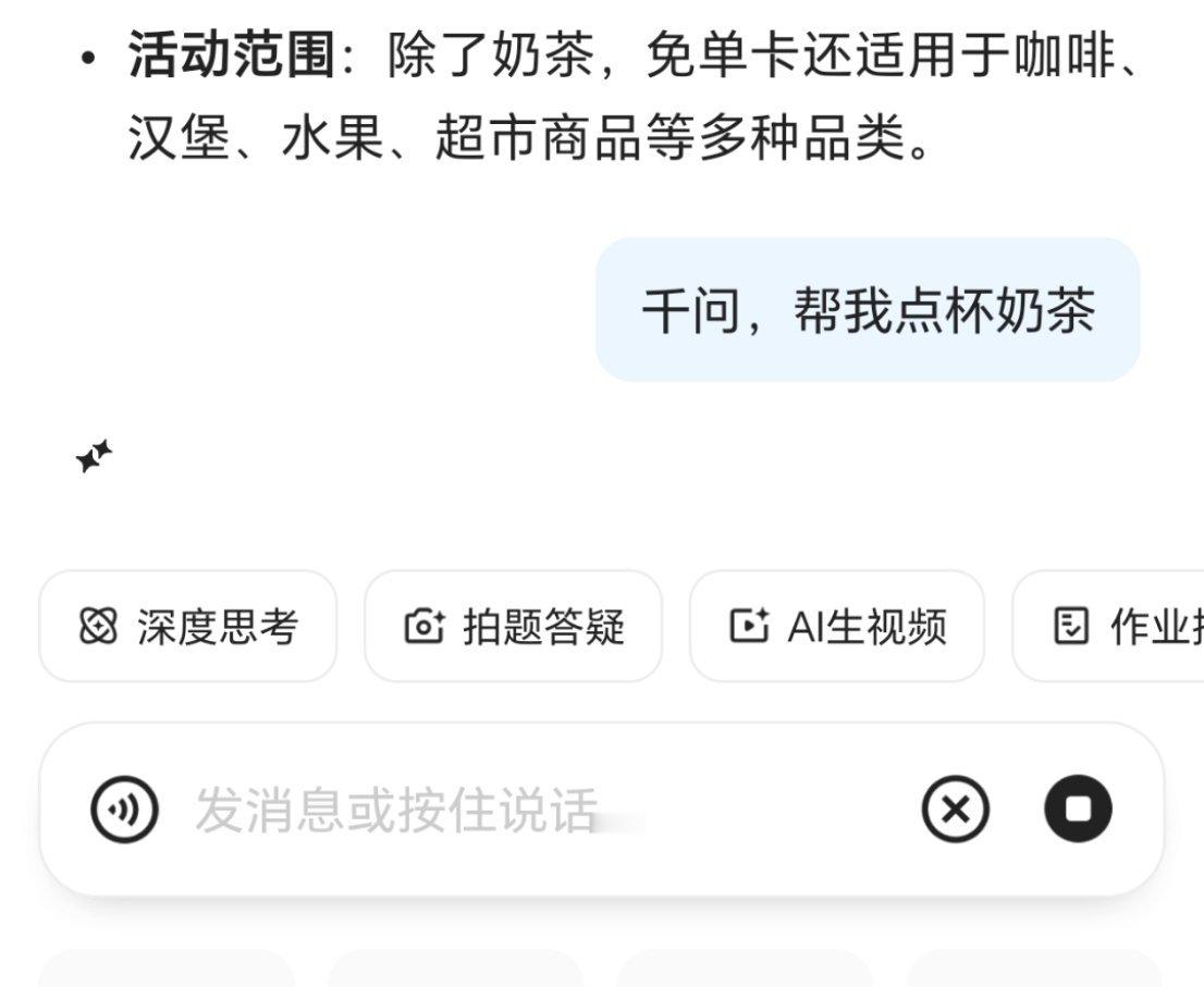 千问让奶茶店爆单了 你今天喝到免费奶茶了吗?现在人太多了,我这一直卡着没反应…