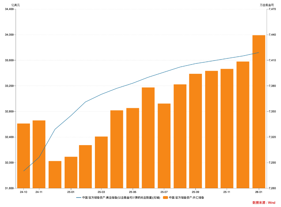 2月7日,国家外汇管理局统计数据显示,截至2026年1月末,我国外汇储备规模为33991亿美元,较2025年12月末上升412亿美元,升幅为1.23%。这是我国外汇储备连续第六个月站上3.3万亿美元大关,续创2015年12月以来新高。