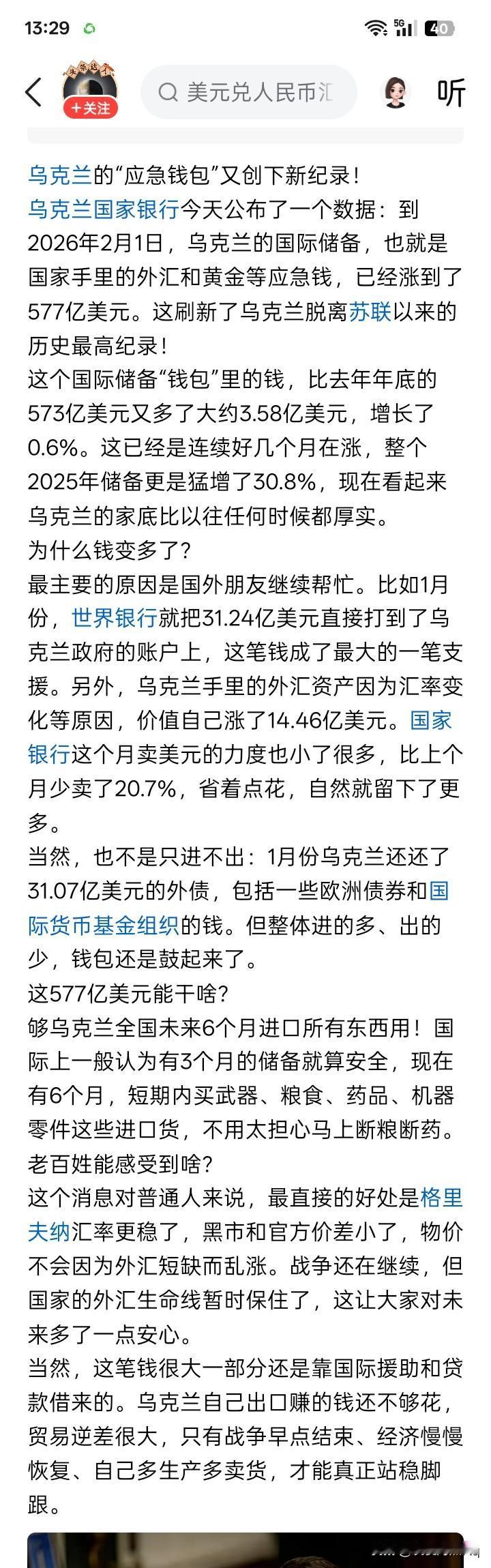 说明什么? 在旷日持久的、即将进行了整整四年抵抗战争的乌克兰,无疑是处于危机四伏,困难重重,甚至是还可能存在着朝不保夕的危难之中。 但是,就是在这种差不多可以说是极端困难的情况下,乌克兰囯家的外汇储备在2月1日已经达到了577亿美元的最高纪录。这是个什么意思呢?这好像就是说,乌克兰现在拥有的577亿美元的资金,可以随时在国际市场上购买需要的物资,特别是应急物资。这对处于战争的困难中的乌克兰,大概有着特别重要的意义。 即将已经四年的抵抗战争,乌克兰在西方国家的大力支持和援助下,大鹅们的进攻和袭击并没有彻底的打垮乌克兰,至少在经济上是如此。 只要双方都还继续有经济力量——因为如果没有经济力量,也谈不上军事力量,那么,从目前的情况看,战争还要继续进行下去,最终鹿死谁手,拭目以待。