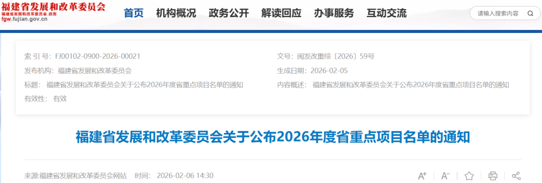 2月6日,福建省发展和改革委员会发布《关于公布2026年度省重点项目名单的通知》。