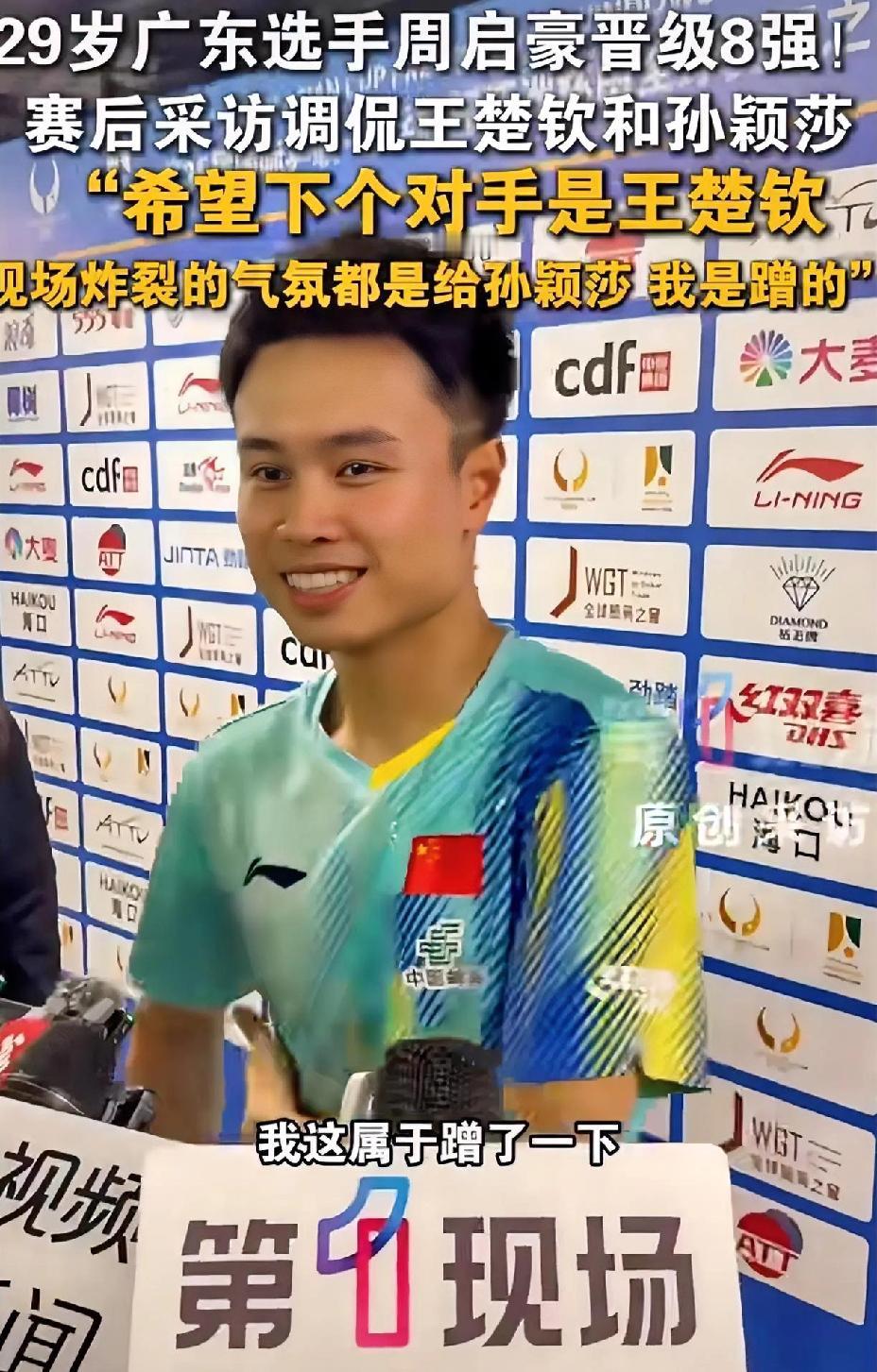 周启豪调侃自己, 蹭了莎莎“一波流量”, 7号情商还挺高。 其实不算蹭, 你打得也非常棒。 亚洲杯男单1/8决赛, 周启豪3:0阿里, 成功晋级男单八强。 赛后采访, 记者说他也打了几个精彩球, 现场气氛很炸裂。 周启豪笑着说, 炸裂是孙颖莎那边, 他也只是蹭了一下。 这孩子真够实诚的, 怎么光说大实话。 其实你今天打得也非常棒, 不算蹭, 你也值得这样炸裂的气氛。 1/4决赛周启豪将对战王楚钦, 国乒内战输赢无所谓。 最近7号的球技势不可挡, 看他和王楚钦谁能笑到最好。 (图片源自于水印)