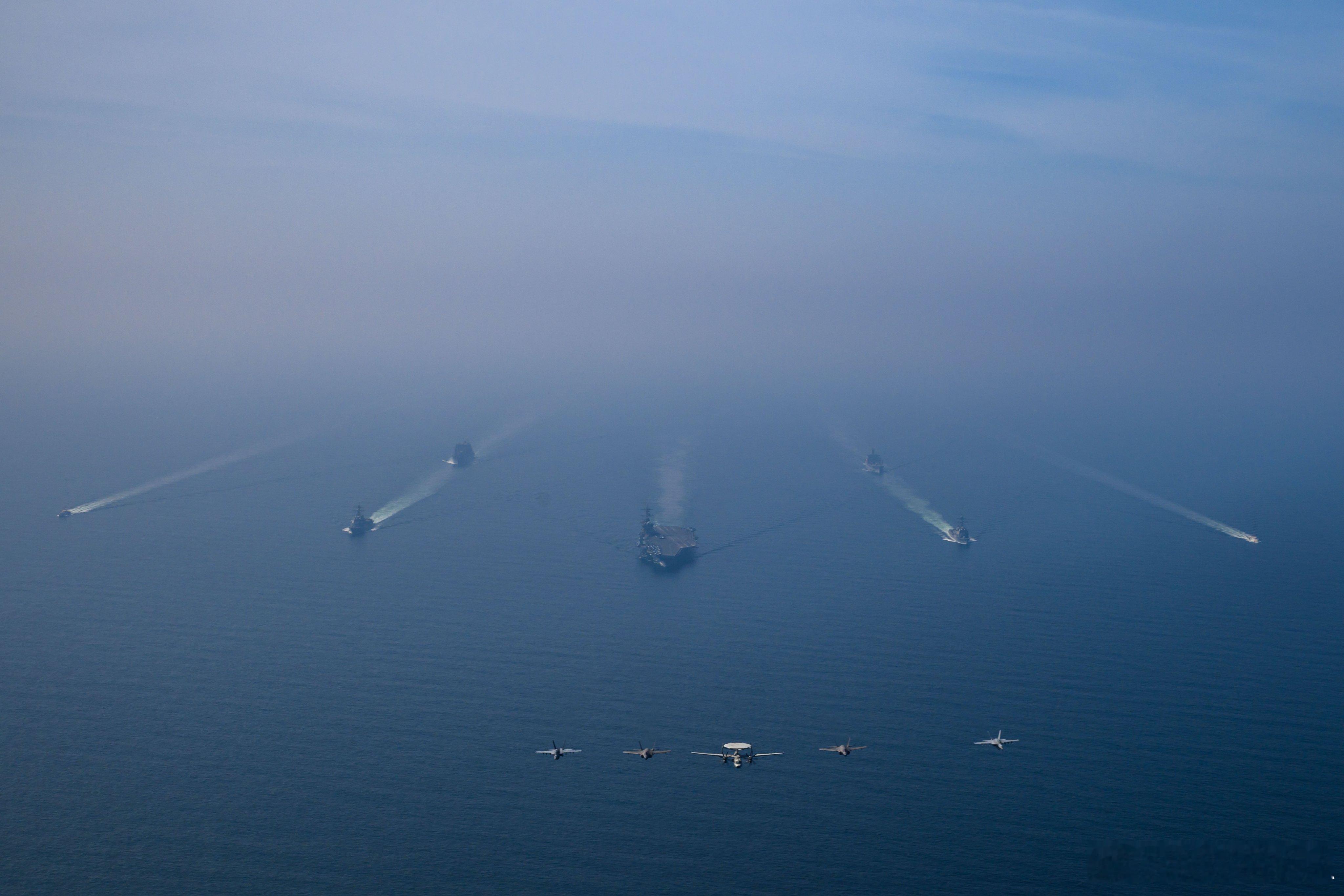 美伊对峙 在阿曼德美伊非直接会谈期间,美国中央司令部立即组织在阿拉伯海游荡的“林肯号”航母战斗群搞了一场武装巡游,恫吓正在与美国代表团谈判的伊朗人。这套招数,是不是很熟悉?当年在板门店美国人也用过,结果挨了中国人民志愿军一顿大逼兜后老实了。美国中央司令部配发的新闻稿:“亚伯拉罕・林肯号航母打击群在两艘军事补给舰和两艘美国海岸警卫队巡逻舰的伴随下,今日一同在阿拉伯海航行,与此同时,第 9 舰载机联队的飞机在头顶上空飞行。以实力求和平!”