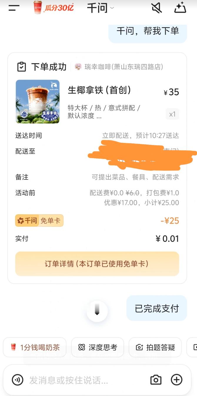 余宇涵舞姿曼妙一分钱奶茶更想要余宇涵更想要奶茶,我更想要你小余,千问你是会请人的。这波福利我OK,来了直接领25元真免单卡,1分钱能在千问AI上买到各种各样的东西。今天的早餐和咖啡我就让千问AI给我安排了吧。希望大家多多支持咱们小余好吗千问免单