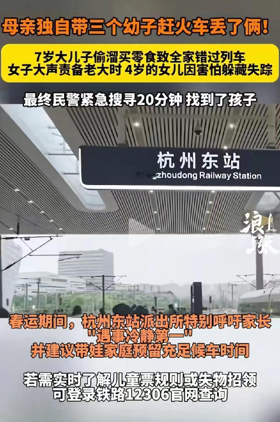 惊魂一刻!浙江杭州,女子拉着7岁的儿子、4岁的女儿,怀里还抱着一个小婴儿去赶火车。临近检票时,却发现儿子不见了,她吓得魂都飞了,赶紧向民警求助,原来,儿子想吃零食自己去了商店。因为找儿子,导致全家错过火车,女子顿时崩溃,大声训斥儿子,谁知,女儿害怕自己也被骂,悄悄跑掉躲了起来。好在民警经过20多分钟的寻找,终于找到了孩子,对此,女子自责不已。 春运期间,杭州东站里人潮涌动,到处都是行色匆匆的旅客,车站里拥挤得水泄不通,张女士就是这赶路大军中的一员。 2026年2月5日下午,她独自带着三个孩子,7岁的大儿子、4岁的女儿,怀里还抱着一个小婴儿。 她的背上背着一个很大的包裹,里面装着孩子们路上要用的东西,手里还提着一些行李,整个人显得十分吃力。 张女士计划带着孩子们前往温州,一家人能团团圆圆过个年。 临近检票的时候,张女士一边留意着检票口的动静,一边叮嘱孩子们别乱跑。 可一转眼的功夫,7岁的大儿子就不见了踪影。 张女士瞬间慌了神,心也提到了嗓子眼儿,她像疯了一样,一边声嘶力竭地喊着大儿子的名字,一边在人群中四处寻找。 周围人来人往,声音嘈杂,她的喊声很快就被淹没了。 张女士急得眼泪在眼眶里直打转,她顾不上自己有多疲惫,也顾不上怀里的婴儿被晃得不舒服,只是一个劲儿地找。 实在没办法了,她赶紧向旁边的民警求助。民警了解情况后,立刻帮忙寻找,最后在检票口旁边的商店内发现了大儿子。 原来,孩子是想吃零食了,看见一家商店,忍不住就擅自离队,跑进去找零食去了。 等找到大儿子,这一番折腾下来,全家已经错过了列车,张女士看着检票口关闭的闸门,情绪一下子崩溃了。 她又气又急,当着众人的面大声训斥大儿子怎么这么不听话,大儿子被吓得一句话也不敢说。 等张女士骂完儿子,情绪稍微平复了一点,谁知一转头,竟发现身边4岁的女儿也不见了踪影。 刚刚稍微稳定的心又悬在了半空中,她双腿都开始发软,再次向民警求助。 民警一刻也不敢耽误,立刻兵分三路开始搜寻。经过20分钟的紧急搜寻,终于在车站西服务台附近找到了躲藏的小女孩。 小女孩看到妈妈和警察,委屈地哭了起来,她怯生生的表示,因为看到妈妈责备哥哥,她好害怕,所以就躲起来了。 张女士听到女儿的话,心里一阵刺痛,后悔自己刚才不该那么冲动地训斥儿子,让孩子这么害怕。 后续,民警协助张女士办理了车票改签事宜,还耐心地叮嘱她出行安全,遇到事情先冷静,及时向民警求助。 不要责备这位妈妈,因为她背后无人,身边无伴,如果孩子的爸爸在身边,她也想有个依靠的,不到万不得已,谁想如此艰辛? 春运期间,像张女士这样独自带孩子赶车的家长不在少数。 在这里也特别呼吁各位家长,遇事一定要冷静,孩子调皮在所难免,发火解决不了问题,还可能让孩子受到惊吓。 同时也建议带孩子的家庭要预留出充足的候车时间,避免因为匆忙而出现意外情况。 毕竟,平平安安、顺顺利利地回家过年,才是大家共同的心愿。
