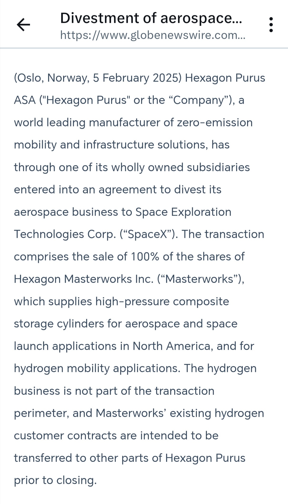 SpaceX以1500万美元收购了Hexagon Purus ASA的航空航天子