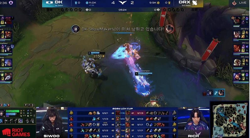 4分钟:双方龙坑混战,Showmakerr输出拉满打出二换四