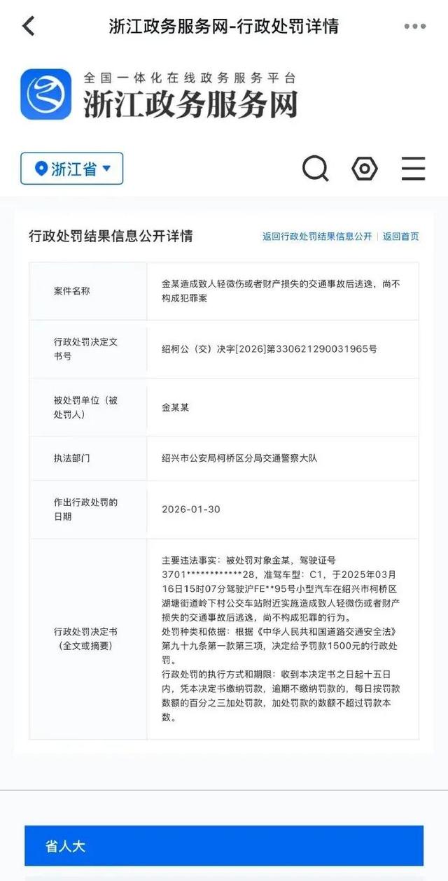 2月7日,据浙江政务服务网显示,演员金晨因交通肇事逃逸被罚款1500元。