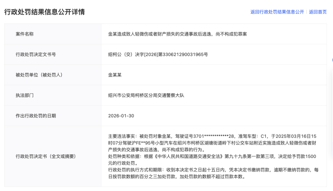 2月7日,据浙江政务服务网显示,演员金某因交通肇事逃逸被罚款1500元。处罚决定书显示,被处罚对象金某于2025年03月16日15时07分驾驶沪FE**95号小型汽车在绍兴市柯桥区湖塘街道岭下村公交站附近实施造成致人轻微伤或者财产损失的交通事故后逃逸,尚不构成犯罪的行为。根据《中华人民共和国道路交通安全法》第九十九条第一款第三项,决定给予罚款1500元的行政处罚。