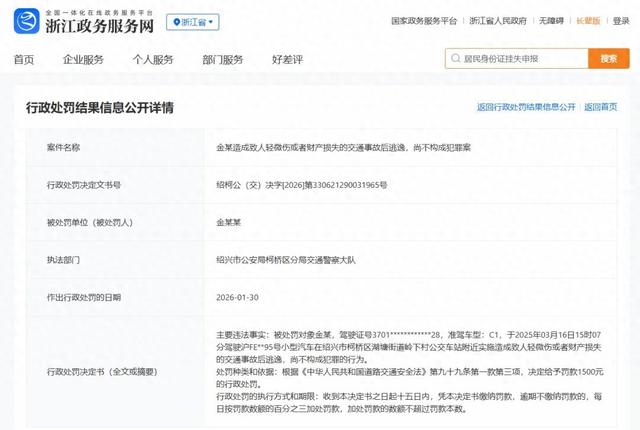 近日,“金晨涉嫌交通肇事‘顶包’事件”有新进展。浙江政务服务网公开了行政处罚决定书。
