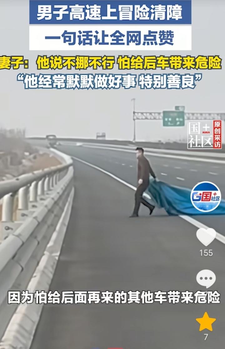 骨子里的善良!广济高速上,男子带着妻子驾驶车辆行驶途中,发现大货车上的雨布遗落在了路上,男子觉得这样太危险,于是就冒险去清理,妻子担心危险不让去,男子却说不挪担心给后车带来危险,所以就要第一时间给挪了。 真是刻在骨子里的善良,发现大货车上的雨布掉在高速路上,担心会给后方车辆带来危险,就不顾自己的危险去清理,这在换做其他人,可能看到也会觉得不管自己的事,更不会想着是否会给后方车辆带来危险,所以男子这是一种助人为乐的精神,虽然男子这种精神值得我们去学习,但是男子这种做法还是欠缺考虑的,毕竟高速上太过危险,他应该直接拨打高速公路报警电话,说清楚位置,而后自然会有相关人员去清理。 善良的人必定会有福报,希望男子阖家幸福,万事如意,心想事成。