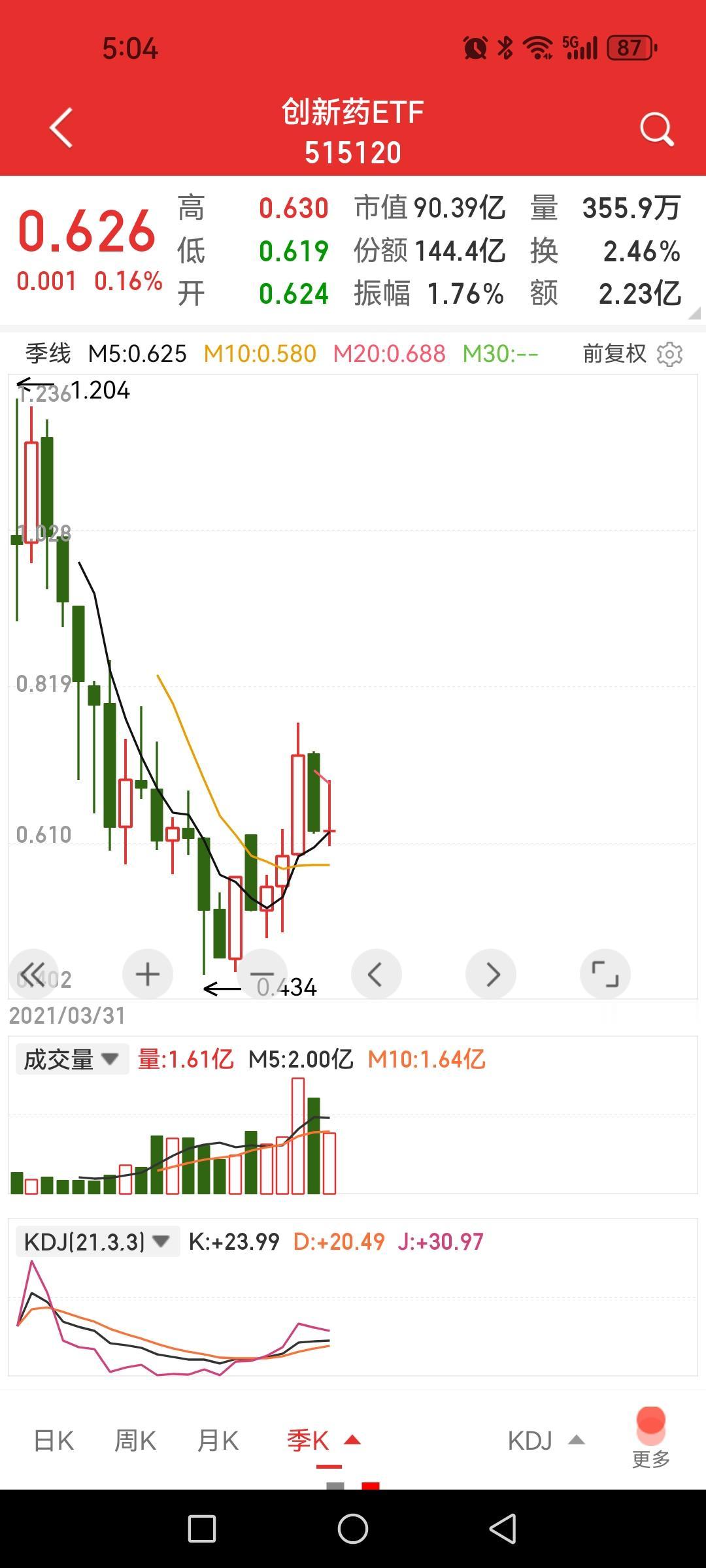 创新药ETF处于什么状态? 1、月线。10月、20月均线向上,5月均线死叉10月均线向下,30月均线由下跌转平刚刚微微向上一点点,20月均线在上个月金叉30月均线。 2、季线。5季均线上穿10季均线向上,10季均线由下跌走平。20季均线刚形成处于向下,由于时间较短30季均线尚未形成。季K线上看形成突破5季均线回踩5季均线。从季均线上看,后面尚待10季均线拐头向上、20季均线走平的过程以及10季均线上穿20季均线。 从小周期服从大周期的原则上讲,大周期向上,则小周期的波动都是在向上的倾向中进行的。季线10月均线由平转为向上以及20季均线走平都是需要时间的,必须通过股价转为向上和震荡来达成。 看来是一个较长周期的转变过程。
