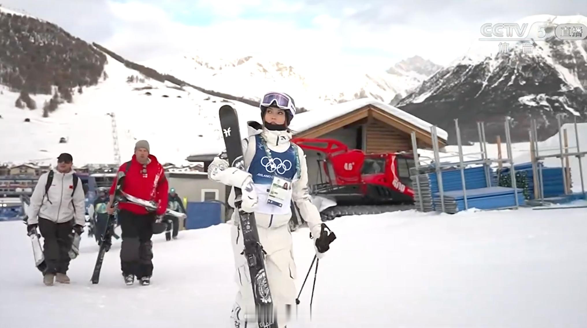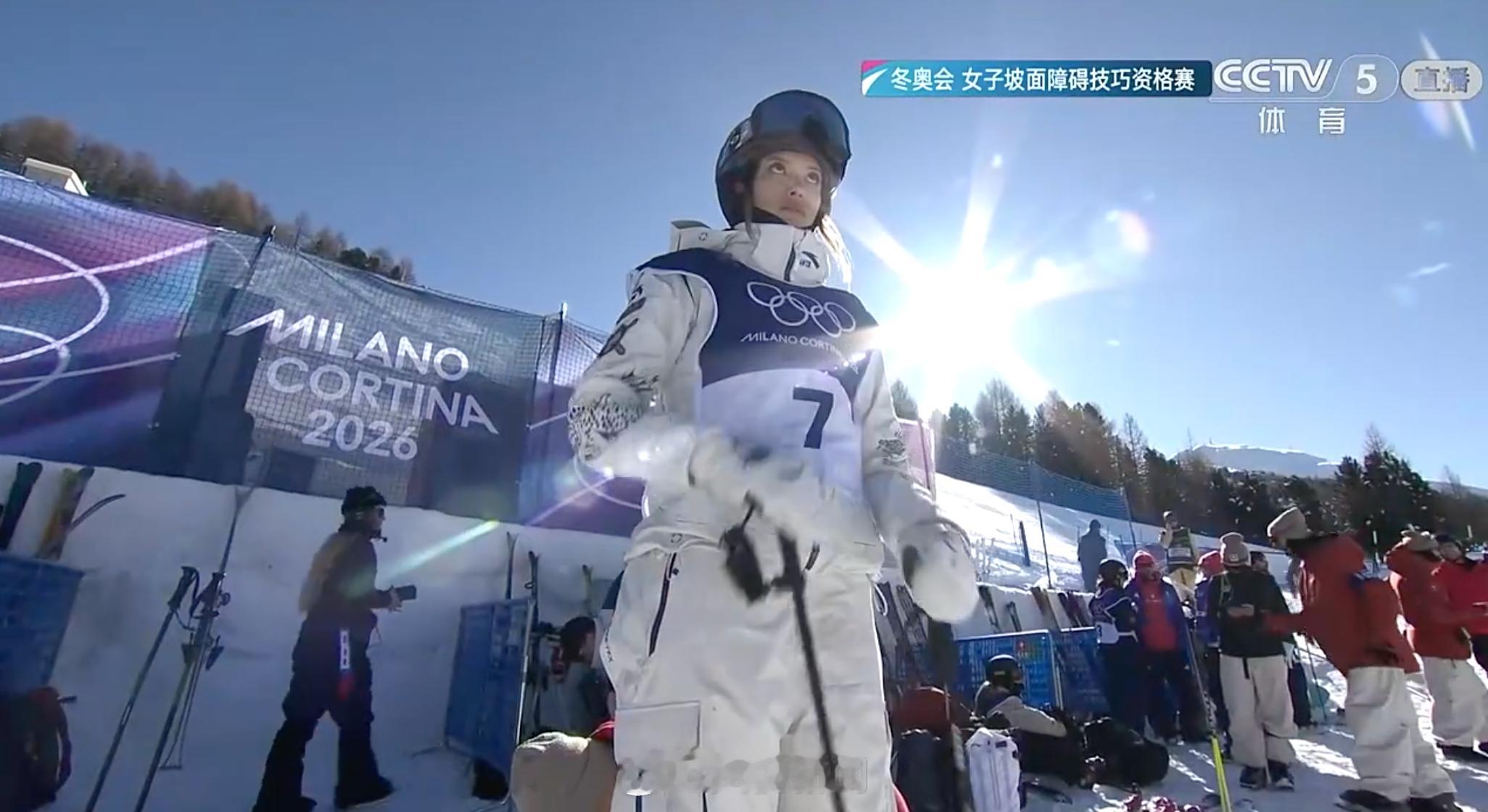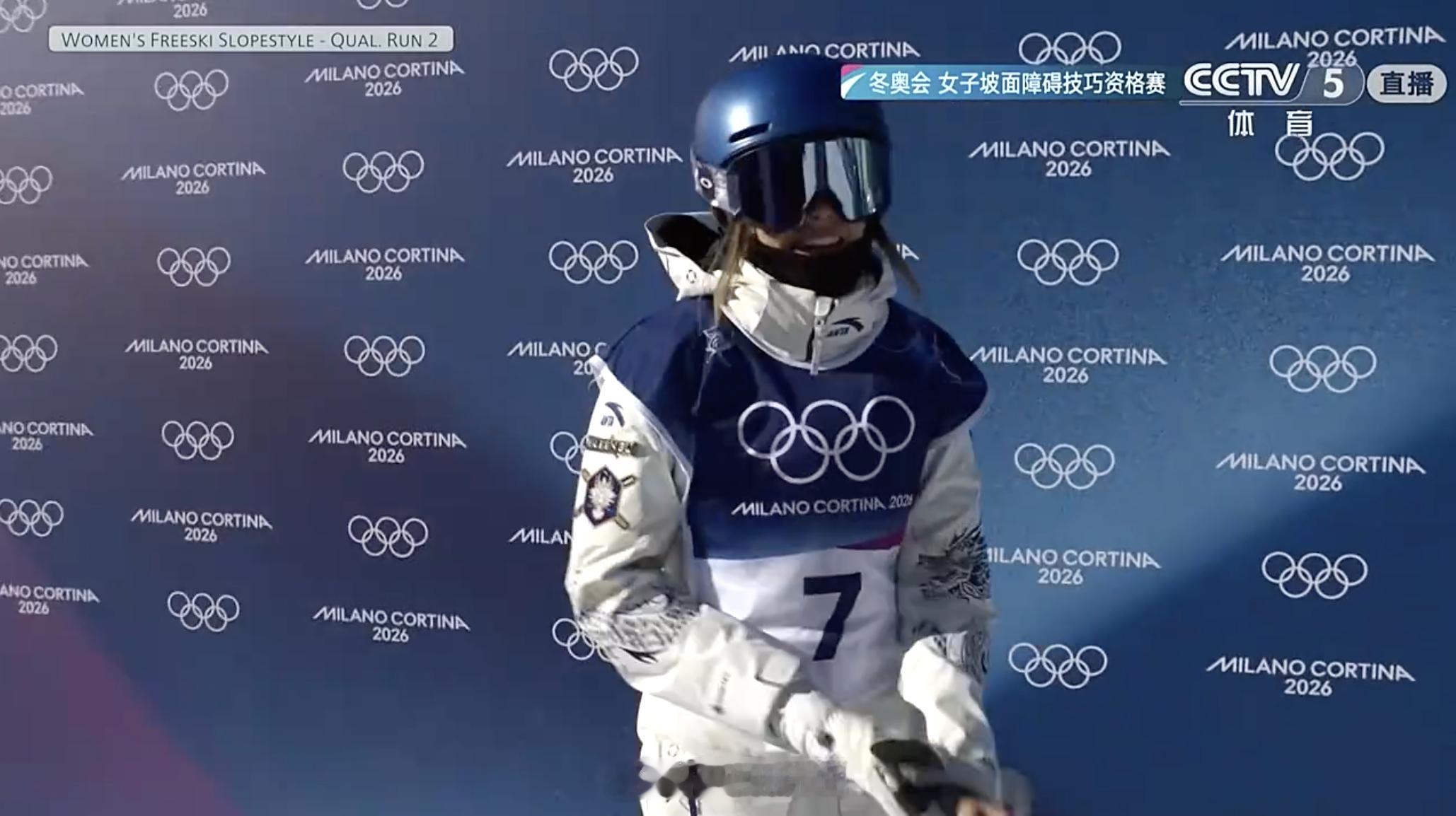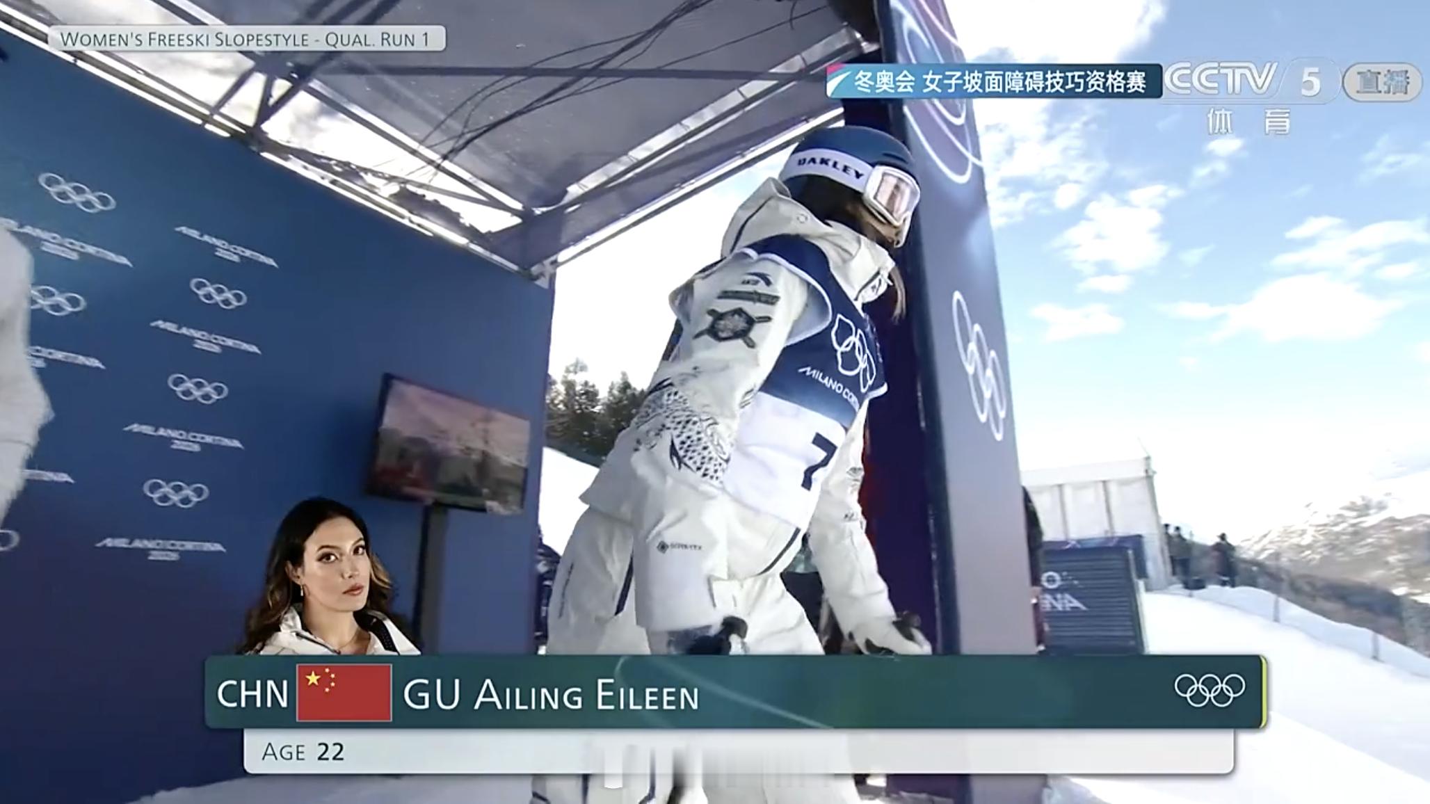 【谷爱凌锁定决赛】米兰冬奥会自由式滑雪女子坡面障碍技巧资格赛,谷爱凌在第一轮滑行