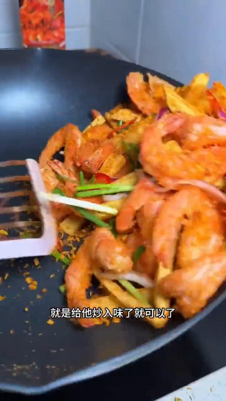 避风塘大虾,酥到掉渣,怎么都吃不腻的大虾。 避风塘炒大虾,一道港式茶餐厅的招牌菜,学会了今年就给它搬到年夜饭上去。这道菜超级受小孩喜欢,酥脆的外壳裹着香甜的大虾,一口下去老满足了,老香了。 ·这个虚的全都剪掉,不要打斜来,一剪这块就一拽,虾线自动就跟出来了,再开个背就OK了。 ·虾水分拿厨房纸擦干净,给淀粉来个三四勺左右,大虾要擦干干的,淀粉老好裹了,裹完了之后炸它就有脆壳了,就特别好吃。 ·还搁了点土豆条,土豆也是来点淀粉,炒的有一点微微变色,大虾回锅,土豆条回锅,炒入味了,现在开大火就可以了。 ·出锅前来点洋葱、小葱、红辣椒,特别简单,就是炒入味了就可以了,撒点白芝麻完事。 虾壳都脆了,这味老好吃了,一定要尝试一下。用这个调料去炒一次虾,皮上的味都感觉盐淡可足了,这个口就比用酱油调那种家常菜做出来更好吃。