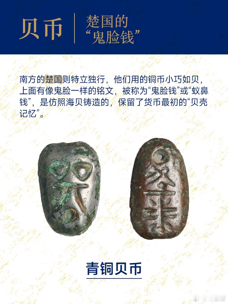考古新知先秦时期的货币 秦统一前,各诸侯国的货币形制千差万别,是“车不同轨”在金融领域的生动体现。中原的韩、赵、魏等地流行布币,由农具“镈”和“钱”演变而来,呈铲形;北方游牧区如燕、赵则多用刀币,形似削刀,颇具悍武之气。南方的楚国最为独特:通行小巧的铜贝,铭文似鬼脸,称“鬼脸钱”(蚁鼻钱);同时因盛产黄金,还铸造了黄金薄板货币“郢爯”。先秦货币的多样,正是列国分治、文化多元的直观见证。想要了解古代支付方式,来国博打卡中国古代钱币展吧。
