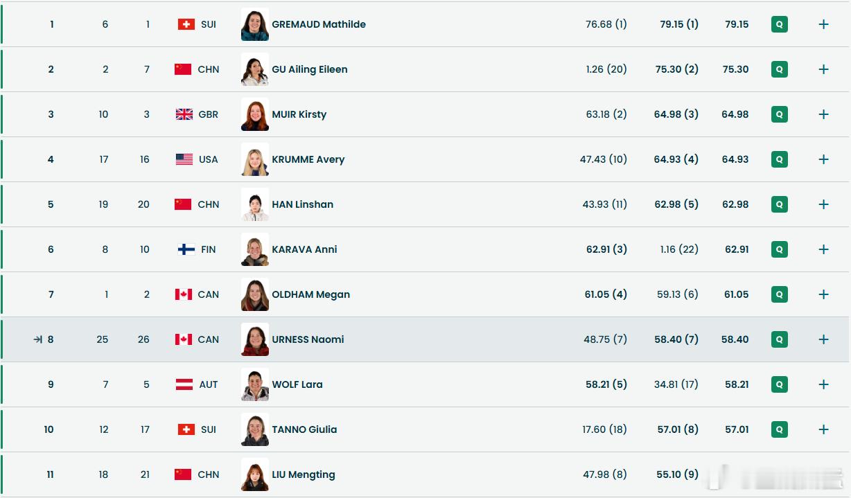 即时排名刘梦婷一度排在第12位这个晋级线上。主项是大跳台的刘梦婷全力表现,第二轮给出55.10分,排名第11位杀入决赛。
