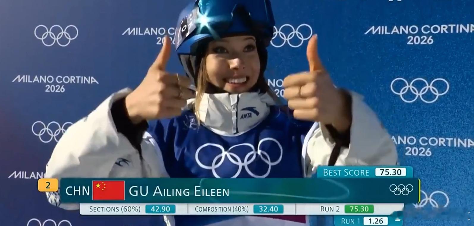 谷爱凌第二轮赛段分数拿到了42.90分,编排组合32.40分,合计总分75.30分!即时排名升到了第二位!