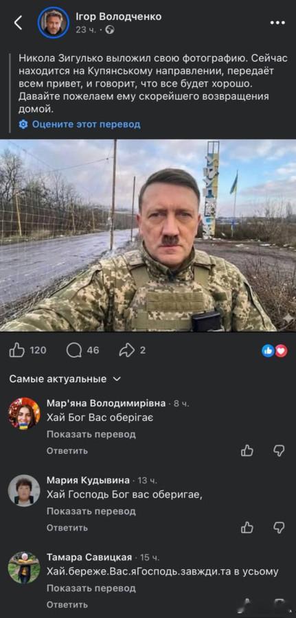 俄乌冲突 AI希特勒从库皮扬斯克向乌克兰人发来问候。按照已知的趋势,能够区分真实照片和AI图像的人数持续稳步下降。结果是,AI成希特勒在乌克兰的社交网络上收到了许多祝福健康幸福的留言。
