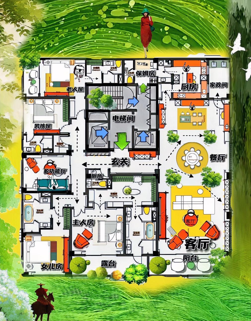 让你高看一眼,平凡大平层,掏心窝子说,560㎡要腾达,横厅能谋事,主卧有魄力,玄关不潦草! 你看,把26个空间凑一起,打造出一亩地大宅,从东到西,看布局,从南到西,看动线,格局大气,通透有度,这户型也算千挑万选了! 说白了,让朴素的大平层,会发光! 左手边,登堂入室见横厅,气场足是一,通透亮是二,凭着21米落地窗,让三联横厅有治愈感,也就是说一年四季不缺阳光! 这个是腔调,布局上也捧场!半边天的公区,同时解决厨房烧菜,家政间晾衣,最有主见横厅! 右手边,四居室运气太好,玄关背景墙采用隐世,背后藏着主卧,想法很大胆,50㎡面积只有80㎡客厅能相比,一个布局严谨,另一个天然通透! 最出彩的两个生活平台! 不以颜值来戳心窝,而是以格局重造大平层,以动线激活五间房!