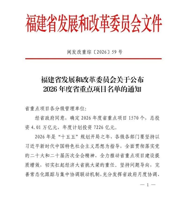 《通知》明确,经省政府同意,确定福建省2026年度省重点项目1570个,总投资4.01万亿元,年度计划投资7226亿元。