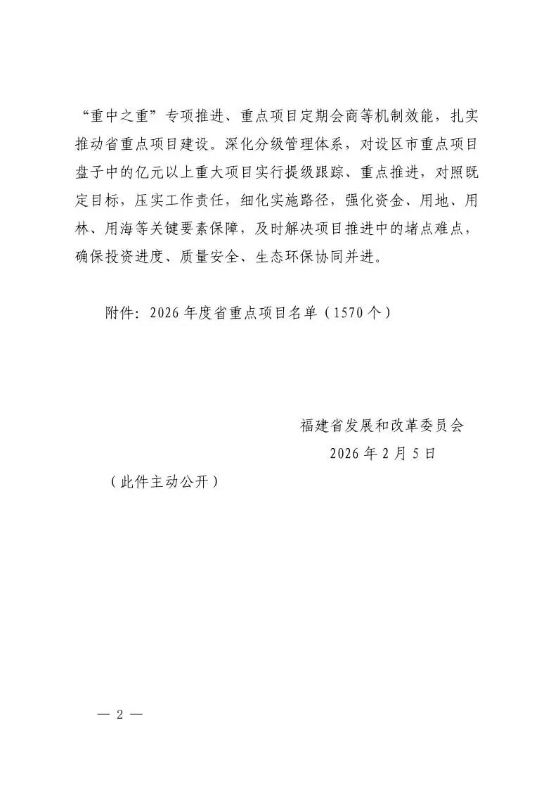 风芒能源获悉,福建省发改委发布《关于公布2026年度省重点项目名单的通知》(以下简称《通知》)。