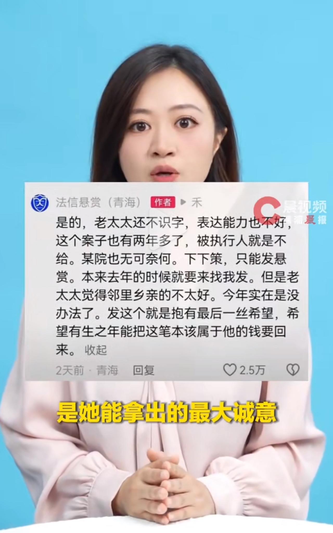 青海这位82岁的李奶奶,省吃俭用一辈子,好不容易攒下40多万,就想买个房子安稳养老,谁知道被同乡骗得一分不剩。法院明明判了对方还钱,可这人直接跑路失联,躲了两年多,就算官司赢了,老人也一分钱都拿不回来。 老人实在没辙了,只能上网发悬赏找线索,可她全身上下翻遍了,就只凑得出50块钱。这点钱还是从每月800块的退休金里硬挤出来的,药不敢买、饭舍不得吃,这50块,是她最后的指望。 刚开始还有人在网上开玩笑,说赏金太少、没诚意,可谁又知道,老人不识字、出门就迷路,为了跑法院、找说法,不知道坐错多少次车、走丢多少回。现在身上一分钱没有,全靠社区的免费粥过日子。 赢官司容易,要钱太难,骗子躲着不露面,老人又不懂复杂的法律程序,维权路走得比谁都难。 50块真的不多,却扛着一位老人全部的晚年和尊严。看着她这么无助,真的特别心疼。 能帮的就帮一把,多转一次,就多一分找到骗子的希望。千万别让老实本分的老人,到老了落得这么凄凉。老年防诈骗 执行难 养老钱被骗