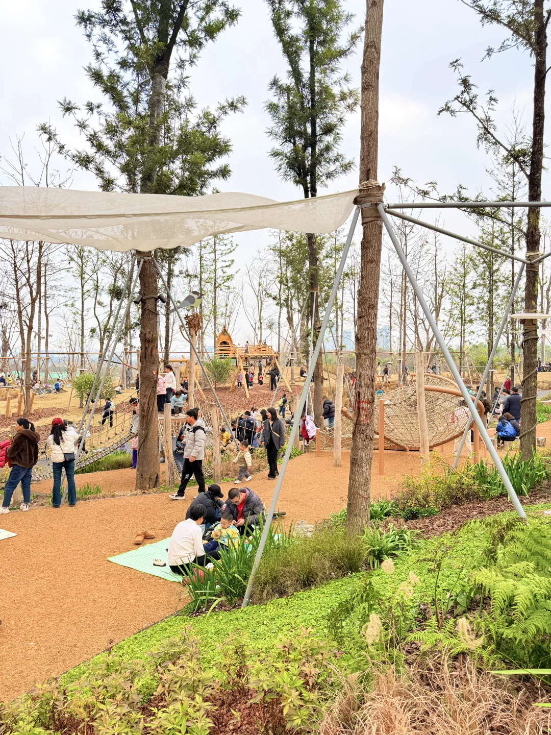 ✅超多的休息木桩和大人可躺的吊床,还可以在轻露营🏕️还有一个毛茸茸乐园,可以带宠物一起玩,旁边还有大草坪➕野营区小朋友滑梯🛝等等