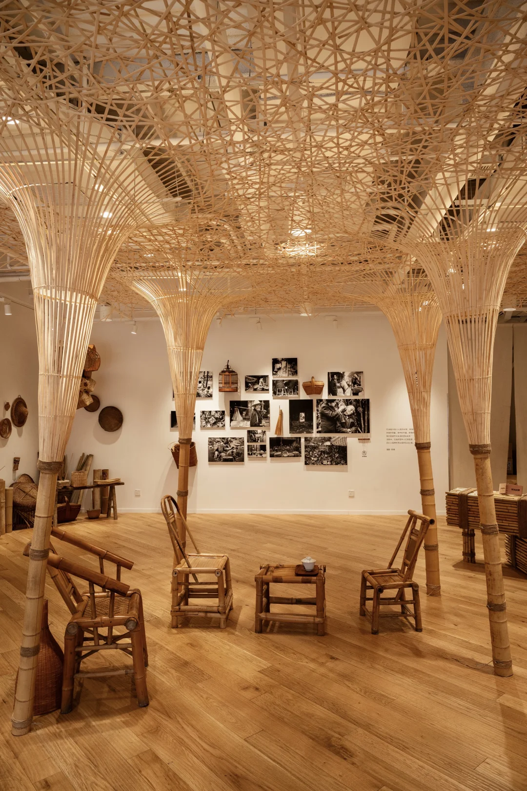 从踏入店门起,竹的意象便悄然铺展。一楼的入口处,是与成都道明竹编非遗传承人杨隆梅老师共同创作的竹编亭,轻轻拉开这场竹韵之旅的序幕。