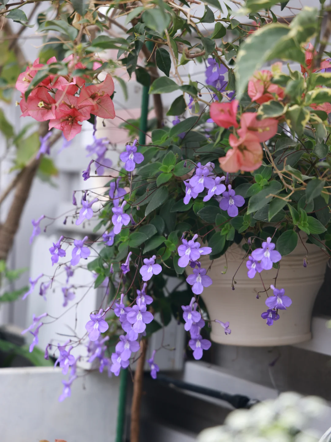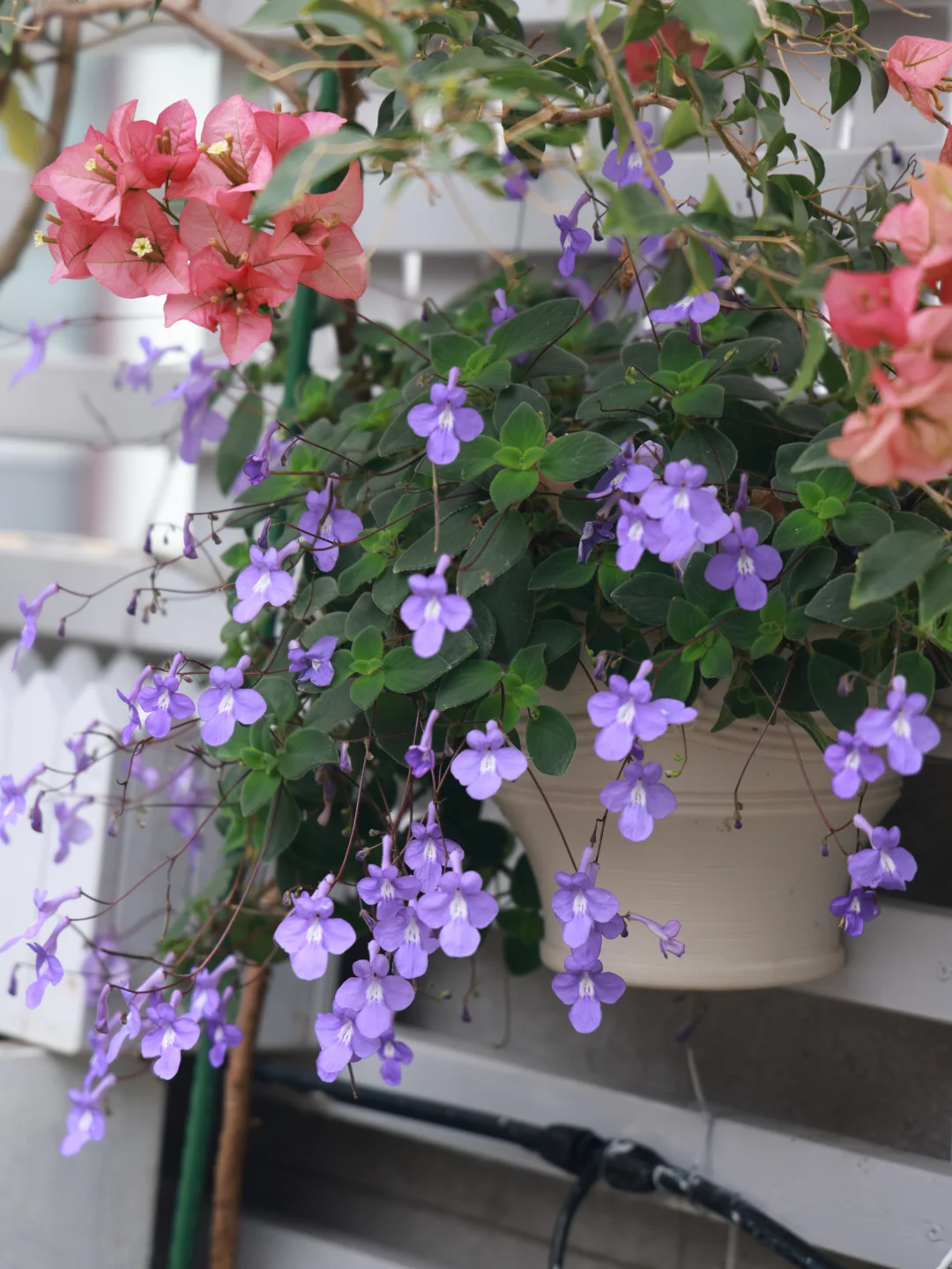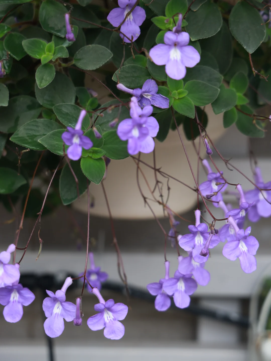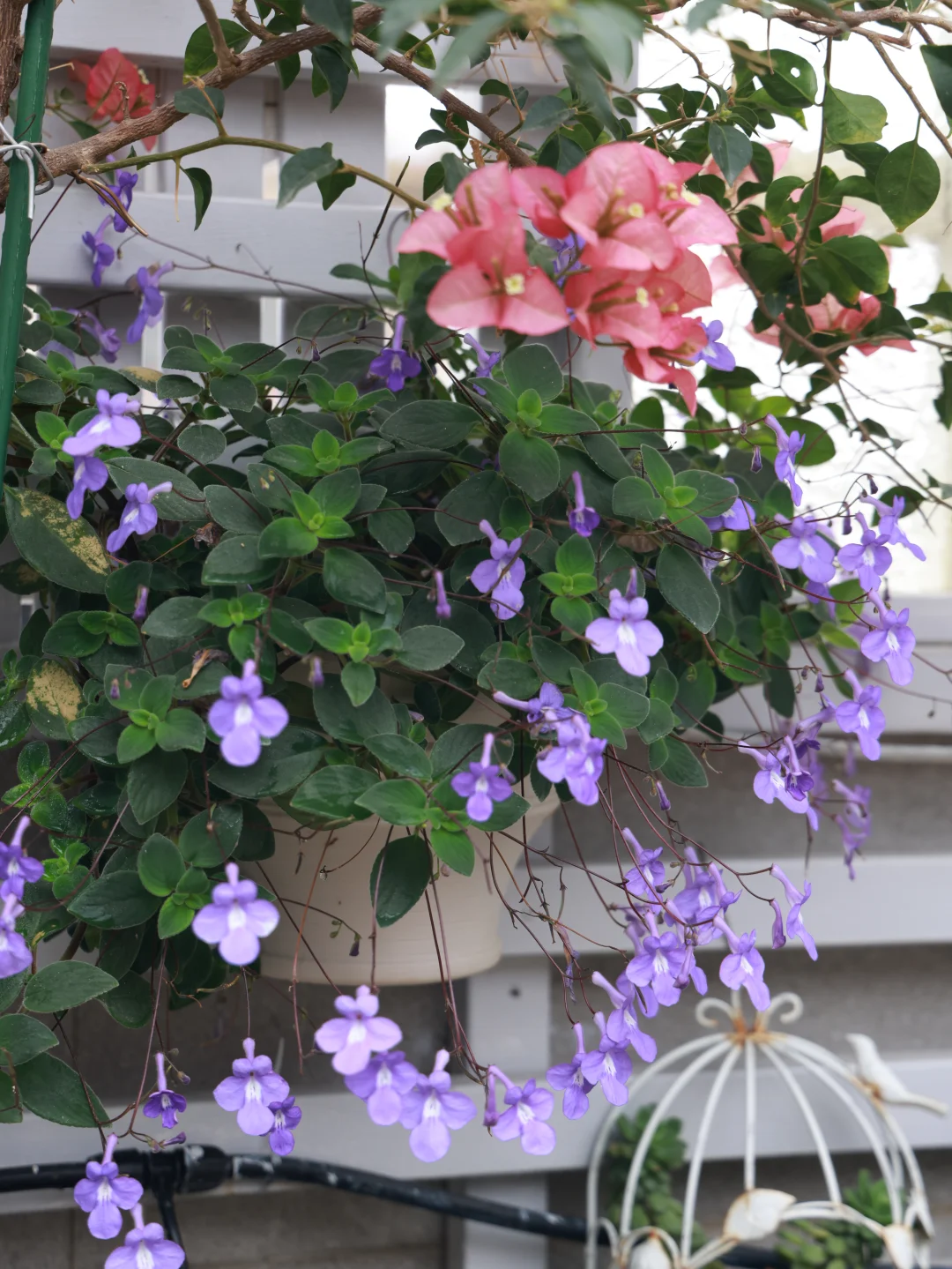 这一盆海豚花还是去年的,平常没怎么管,跟三角梅一起施肥打药而已。挂在花架底下,半阴状态,我想应该非常适合阳台党。而且枝条超级容易扦插存活,准备过段时间扦插多几盆。