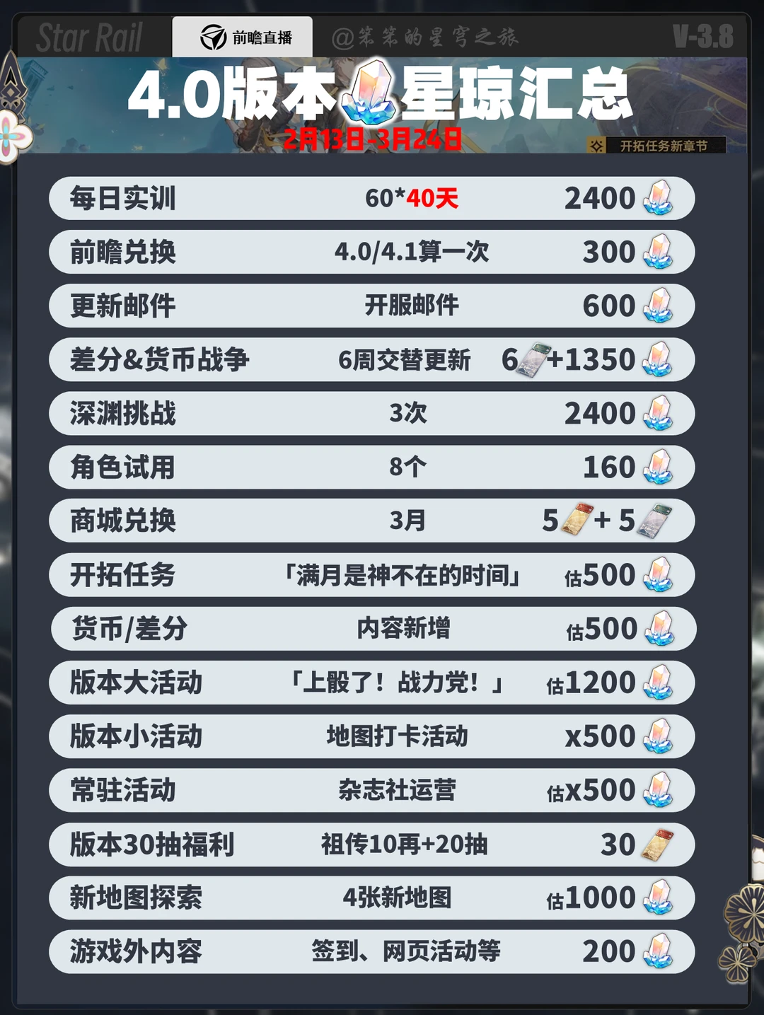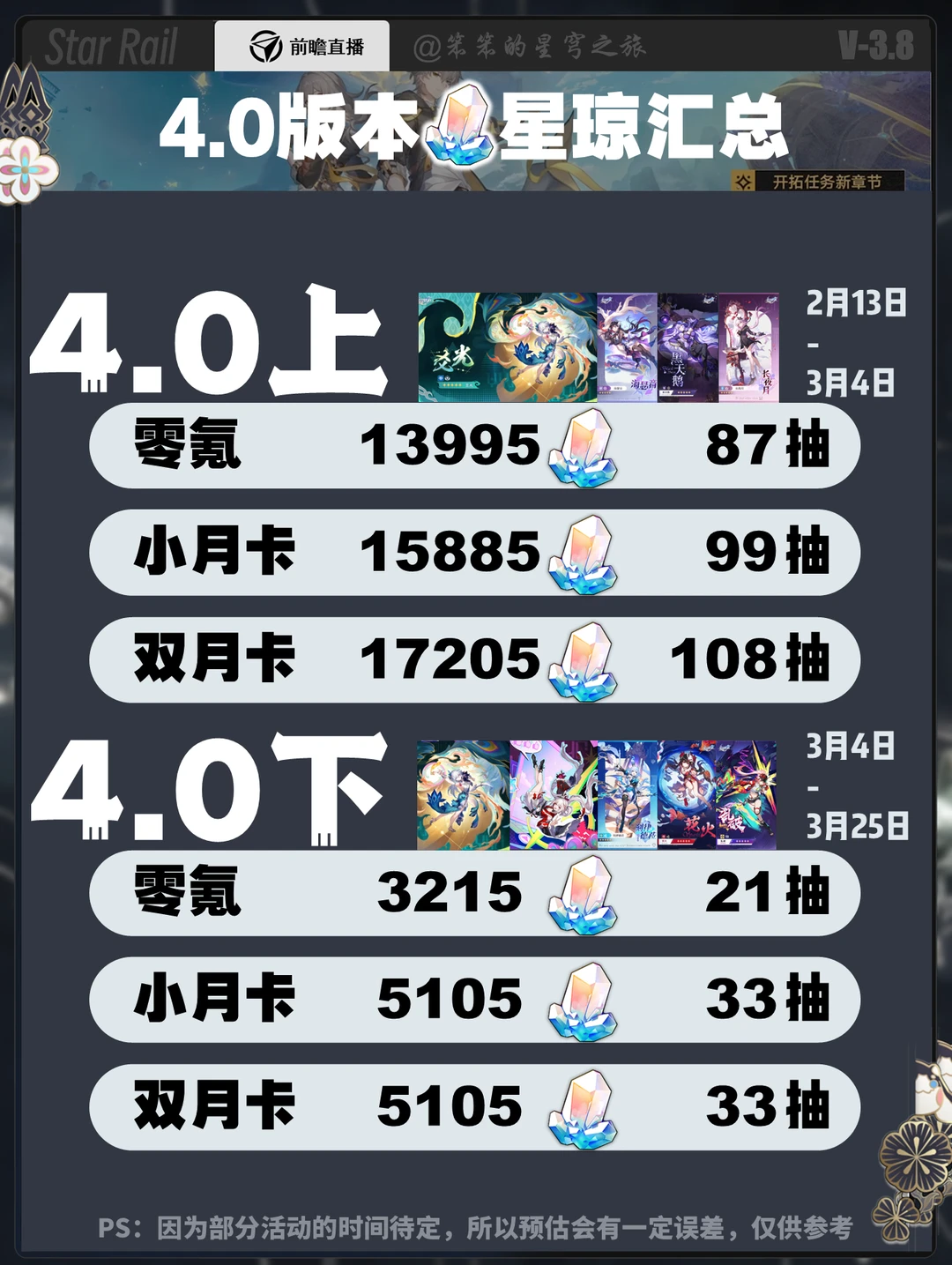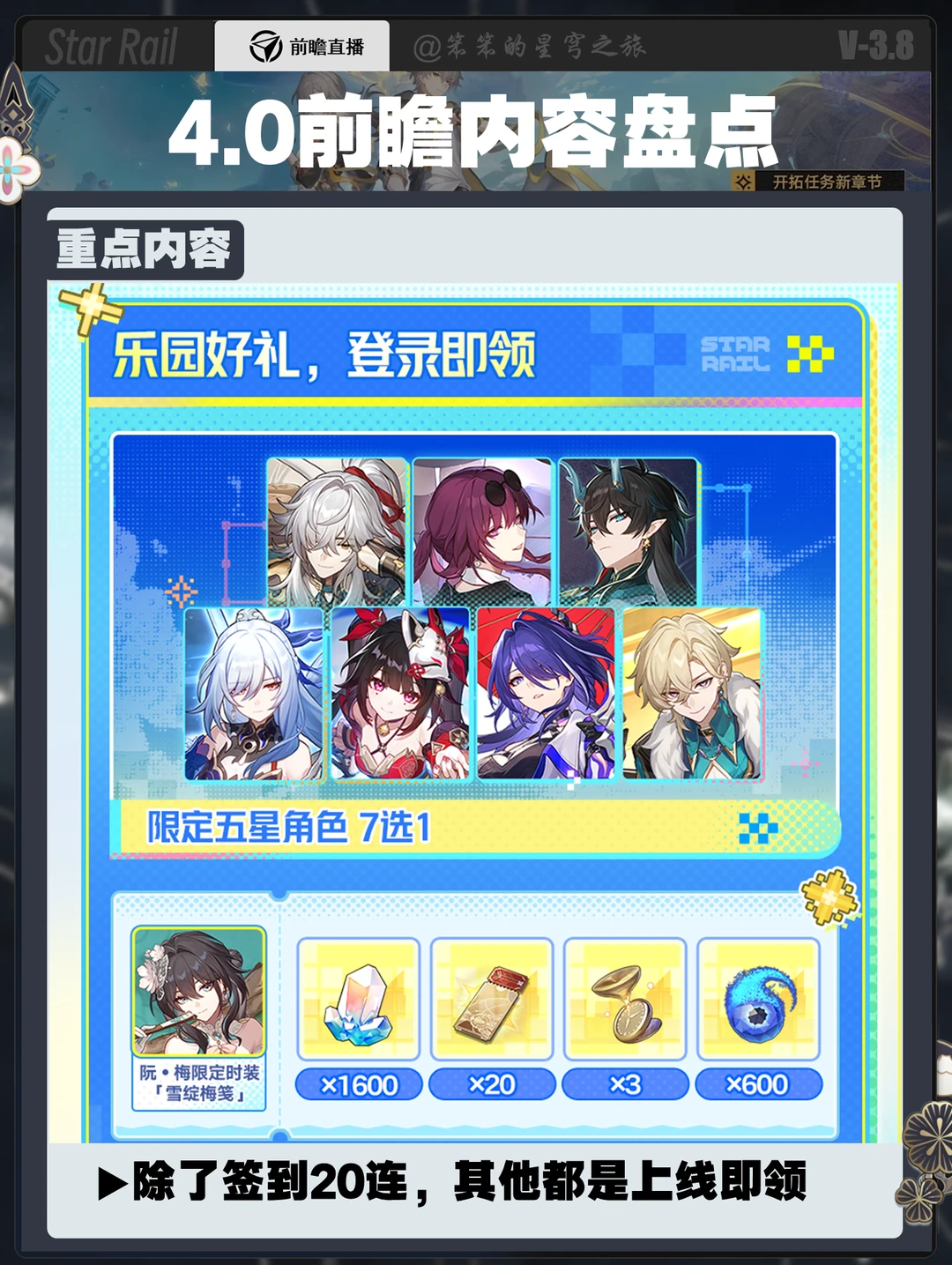 🐱大家好,我是笨笨的铲屎官 4.0版本零氪可以白嫖108抽 小月卡132抽,大月卡140抽 其中版本福利包含 ①祖传的签到十连 ②签到五天拿1600星琼 ③上线即领十连 ④上线即领限定五星七选一 ⑤阮·梅皮肤直接领 ⑥开拓者皮肤及头饰直接领