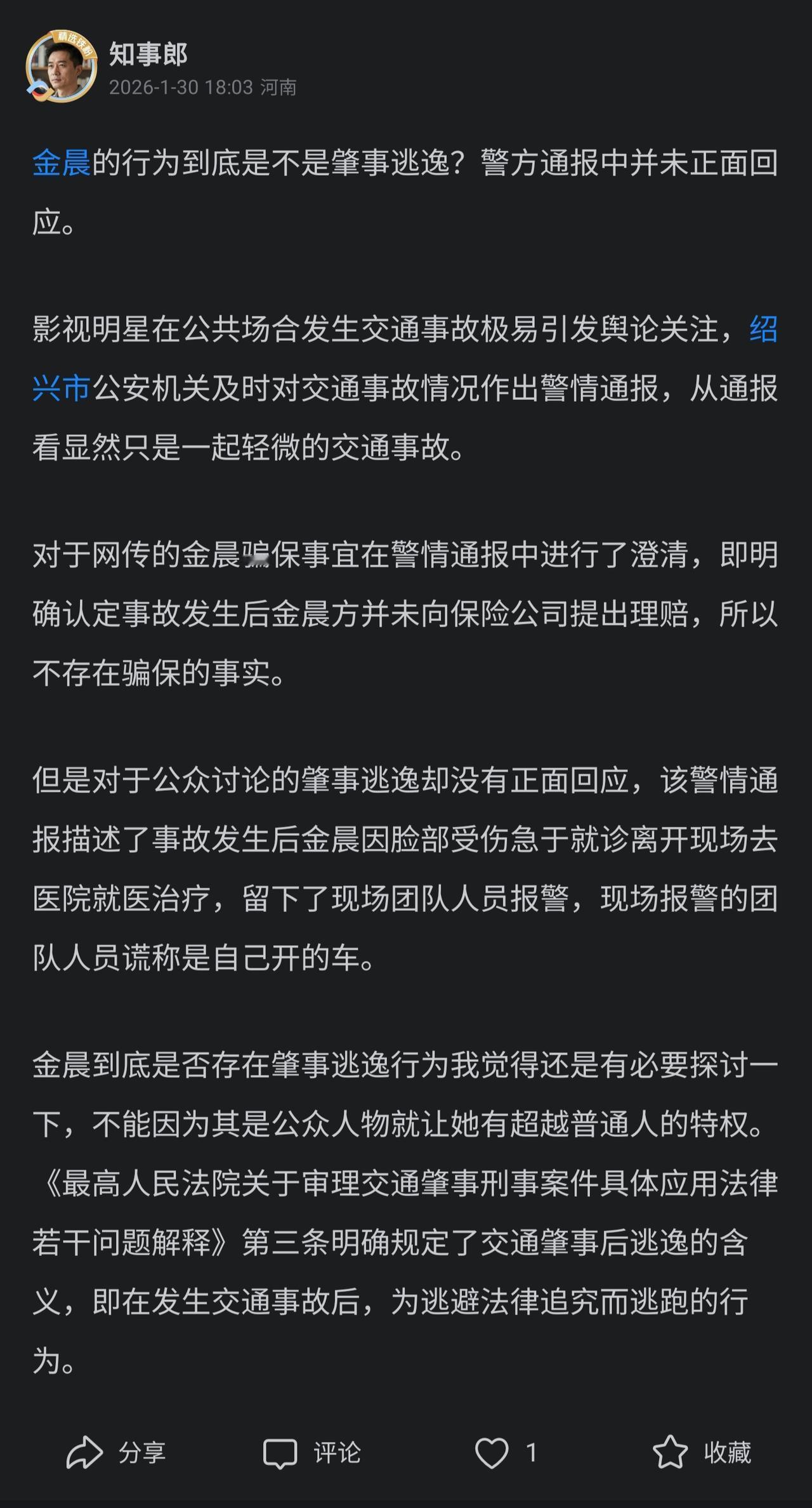 刷到金晨因为交通事故逃逸被行政处罚1500元。基本与我在事发时也就是1月30号发表的微头条观点基本一致。 事故发生初期,虽然警方通报了案件事实,但是比较克制的表述了金晨离开事故现场去医院救治治疗。对其离开现场的行为是否属于肇事逃逸没有进行表述。 我认为金晨虽然是公众人物,但是显然也不具有超越法律的特权。对于其行为是否属于肇事逃逸应根据法律规定进行确认,有兴趣的朋友可以翻一翻我在1月30日对该事件写的一个作品,比较详细的阐述了肇事逃逸的法律认定和一般人事故发生后的处理方式。 翻了翻网友的评论,法院大家对公众人物的容忍度其实远远小于普通人,这里凸显了普通人对公众人物的高度道德感的期待。我觉得公安机关的处罚是没有问题的。 虽然肇事逃逸可以在罚款后并处拘留,但是就该案件来说并没有造成人员损伤,而物品损失金晨方面也已经自掏腰包赔偿完毕,显然情节还是比较轻微,公安机关据此对其不予拘留是体现了人性化的执法理念,也符合过错与处罚相当的基本原则。 这也给公众人物敲响了警钟,在发生突发事件时,一定要保持冷静,严格按照相关法律法规进行处理,不要有任何侥幸心理。