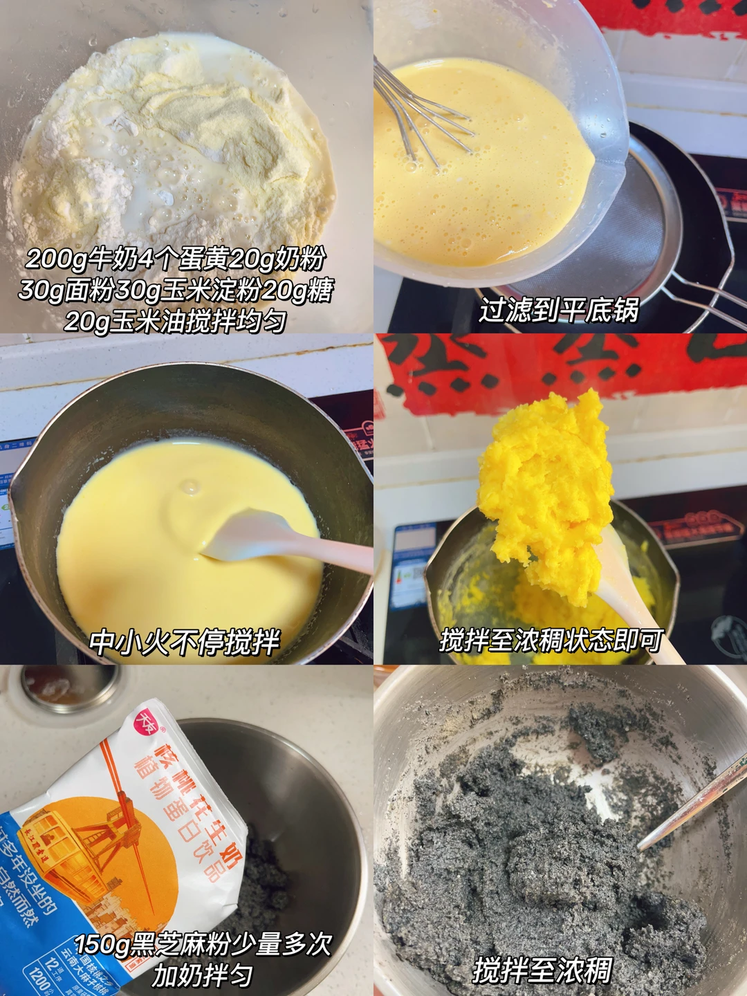 1⃣️先准备奶黄馅,奶黄馅所有食材部分倒入盆中拌匀,过滤到平底锅,中小火不停搅拌至浓稠