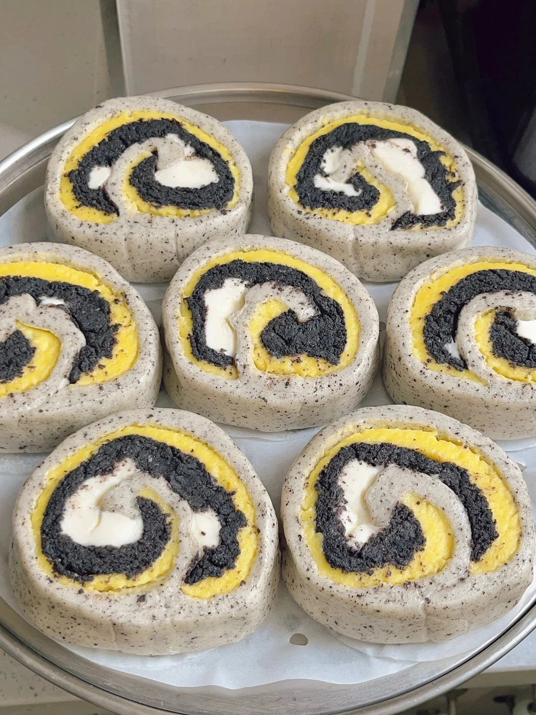 3⃣️接着准备面团,面粉加酵母清水黑芝麻粉揉成团,面团擀成长方形面片,铺上奶黄馅黑芝麻馅,在铺上适量奶酪,从上往下卷起来,切成等份小段,醒发至1.5倍大