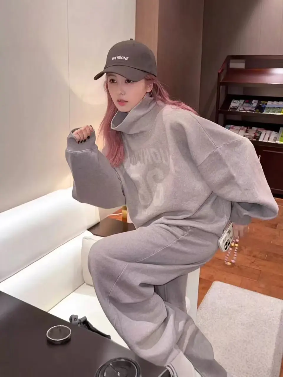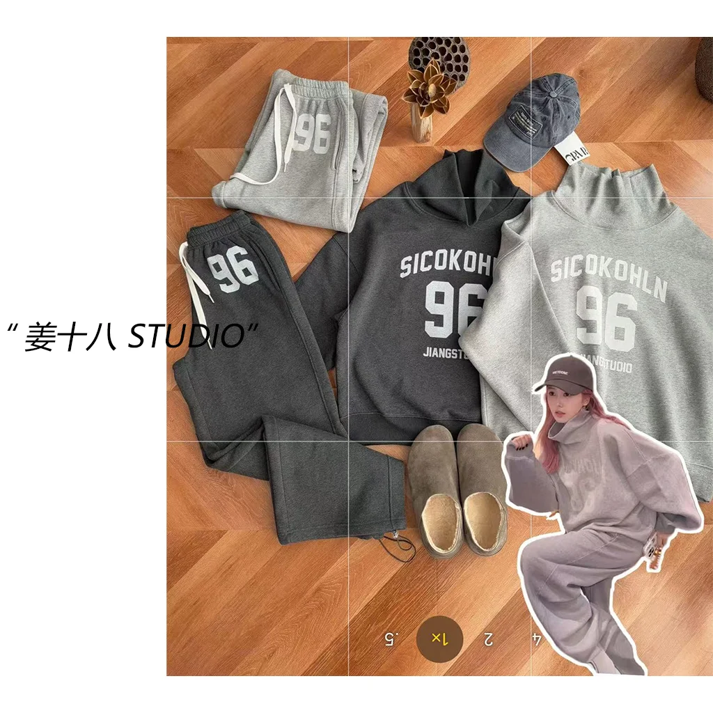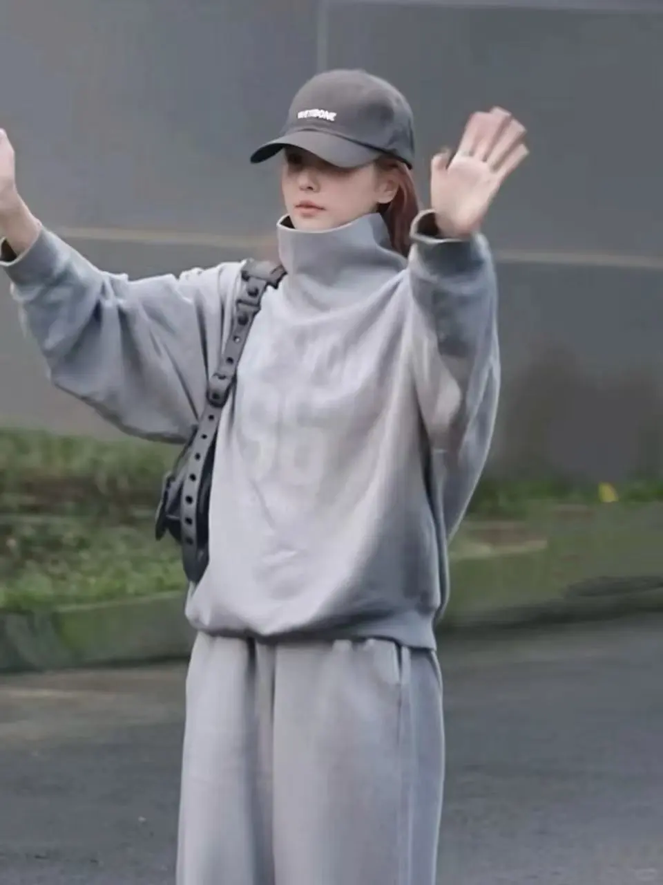 这套韩系运动服一上身就爱住啦✨ 立领设计防风又显脸小 字母印花简约不单调 面料是那种厚实柔软的触感 秋冬穿保暖度刚刚好 宽松版型藏肉一流 配运动鞋或雪地靴都超搭 室内健身or出门遛弯都能穿出松弛感~