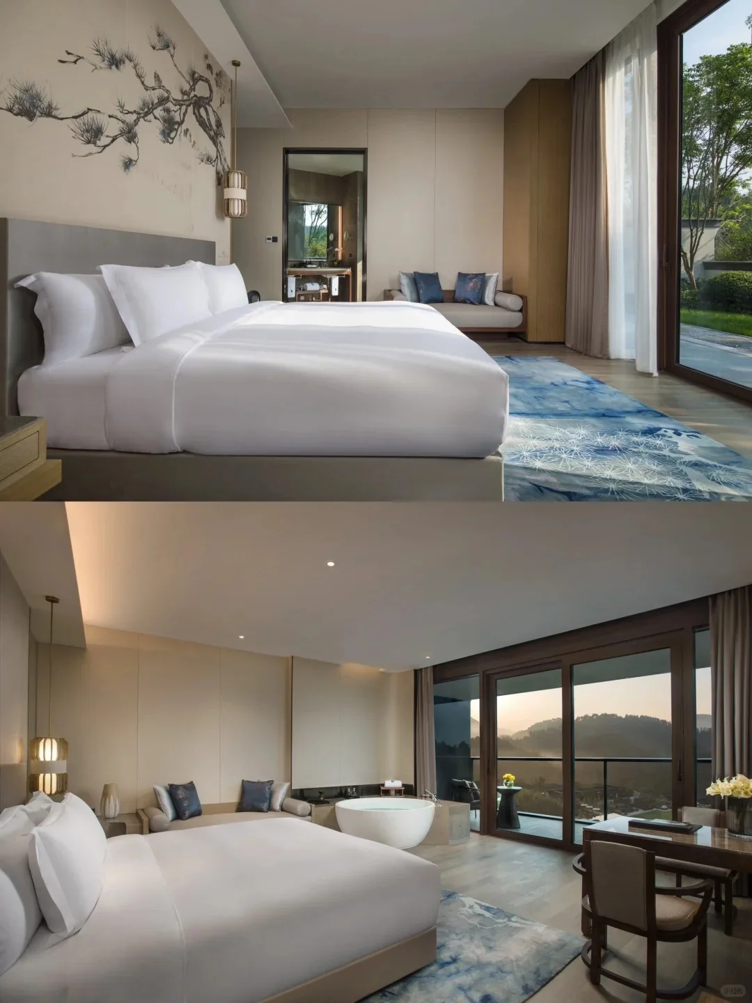 选址即巅峰:酒店坐落在安吉灵峰景区,被连绵的万亩竹海与茶田环绕🌿,是真正的天然氧吧,开窗就是满眼苍翠,治愈力满分!
