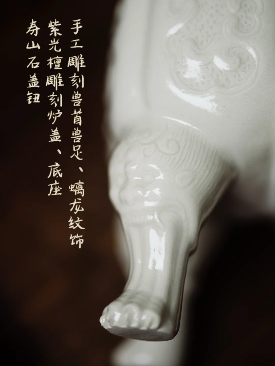 承辽金定窑风骨,四足为庄严兽首。它气场开阔,器宇轩昂,并非张扬的威严,而是向内凝聚的、不容置疑的分量。